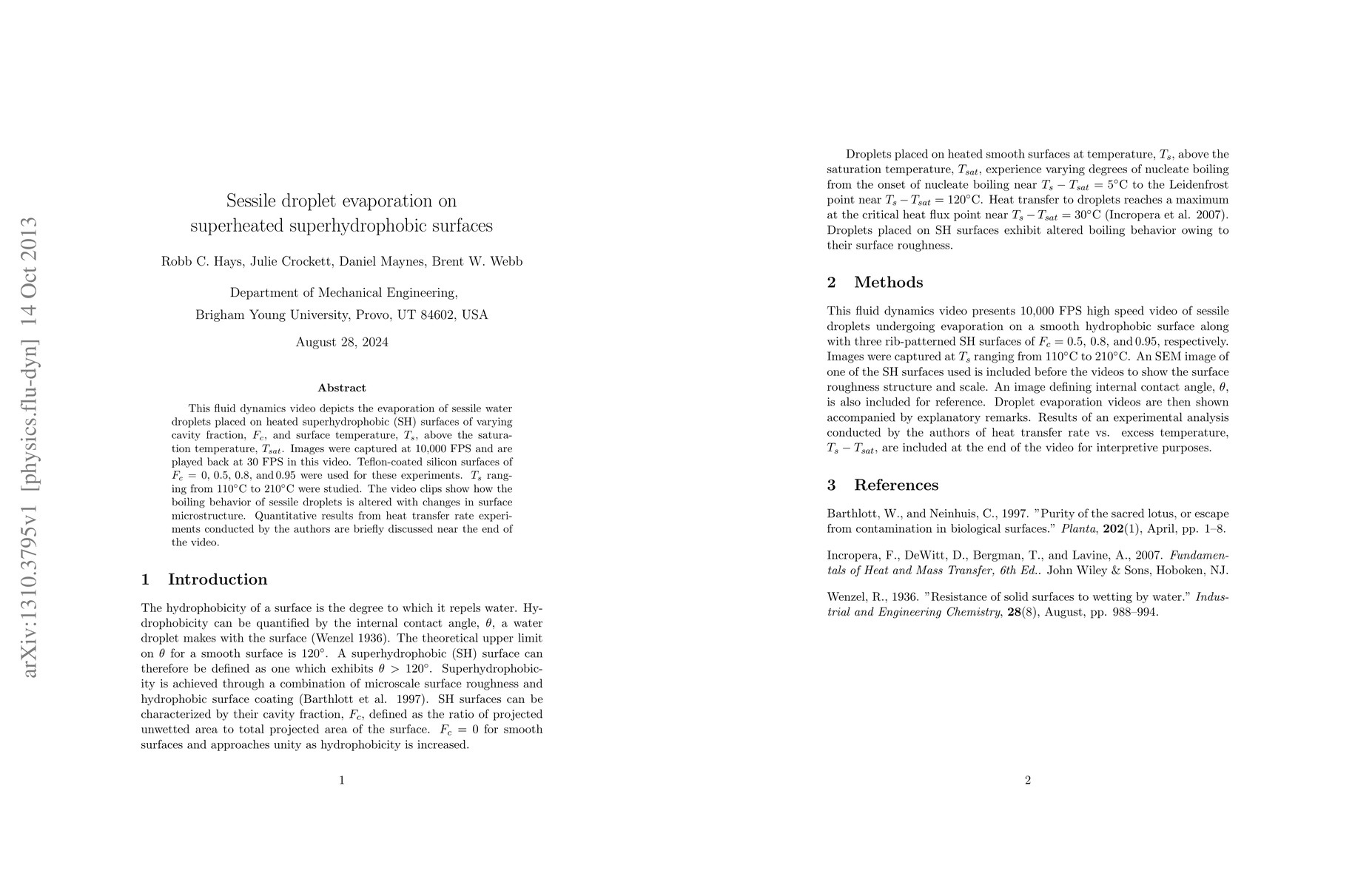 This research investigates the evaporation dynamics of water droplets on superheated superhydrophobic surfaces, revealing how varying surface microstructures and temperatures affect boiling behavior. High-speed video captures demonstrate significant changes in droplet evaporation influenced by surface cavity fractions and temperature.