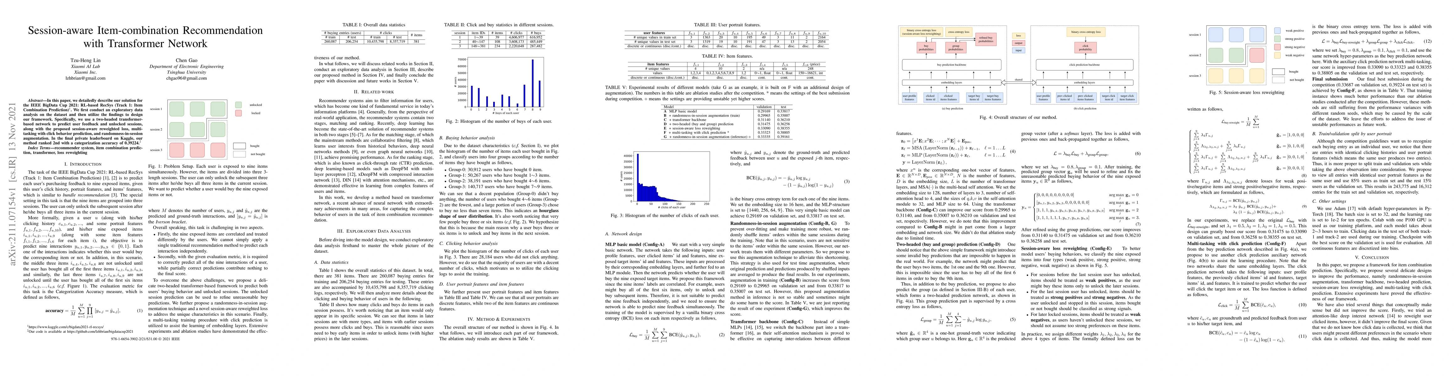 In this paper, we detailedly describe our solution for the IEEE BigData Cup 2021: RL-based RecSys (Track 1: Item Combination Prediction). We first conduct an exploratory data analysis on the dataset and then utilize the findings to design our framework. Specifically, we use a two-headed transformer-based network to predict user feedback and unlocked sessions, along with the proposed session-aware reweighted loss, multi-tasking with click behavior prediction, and randomness-in-session augmentation. In the final private leaderboard on Kaggle, our method ranked 2nd with a categorization accuracy of 0.39224.