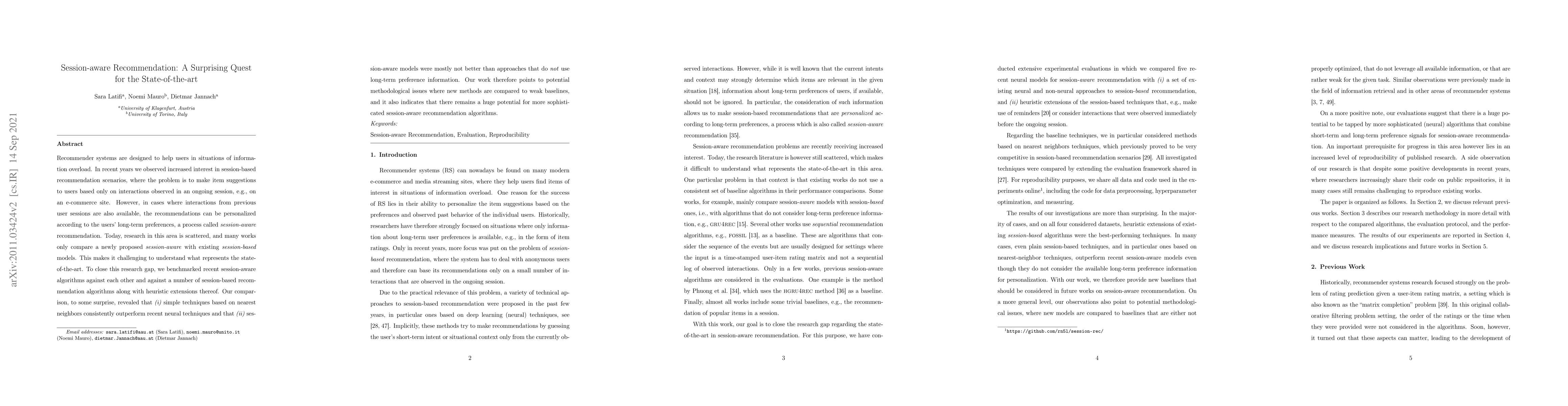 Recommender systems are designed to help users in situations of information overload. In recent years, we observed increased interest in session-based recommendation scenarios, where the problem is to make item suggestions to users based only on interactions observed in an ongoing session. However, in cases where interactions from previous user sessions are available, the recommendations can be personalized according to the users' long-term preferences, a process called session-aware recommendation. Today, research in this area is scattered and many existing works only compare session-aware with session-based models. This makes it challenging to understand what represents the state-of-the-art. To close this research gap, we benchmarked recent session-aware algorithms against each other and against a number of session-based recommendation algorithms and trivial extensions thereof. Our comparison, to some surprise, revealed that (i) item simple techniques based on nearest neighbors consistently outperform recent neural techniques and that (ii) session-aware models were mostly not better than approaches that do not use long-term preference information. Our work therefore not only points to potential methodological issues where new methods are compared to weak baselines, but also indicates that there remains a huge potential for more sophisticated session-aware recommendation algorithms.