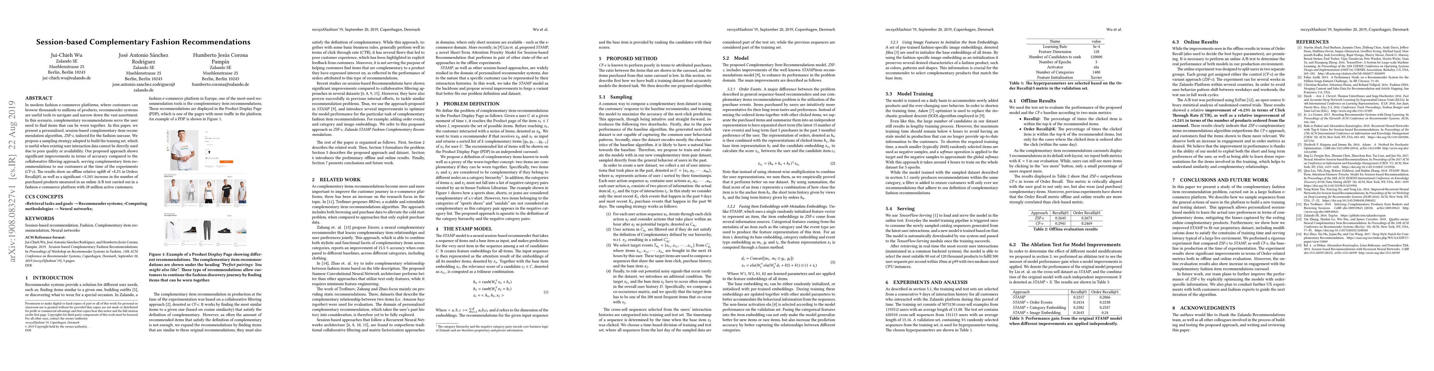 This paper introduces ZSF-c, a personalized session-based complementary fashion recommendation algorithm that significantly improves recommendation accuracy over collaborative filtering. The approach demonstrates an 8.2% uplift in Orders Recall@5 and a 3.24% increase in purchased items in an online A/B test on a platform with 28 million active users.