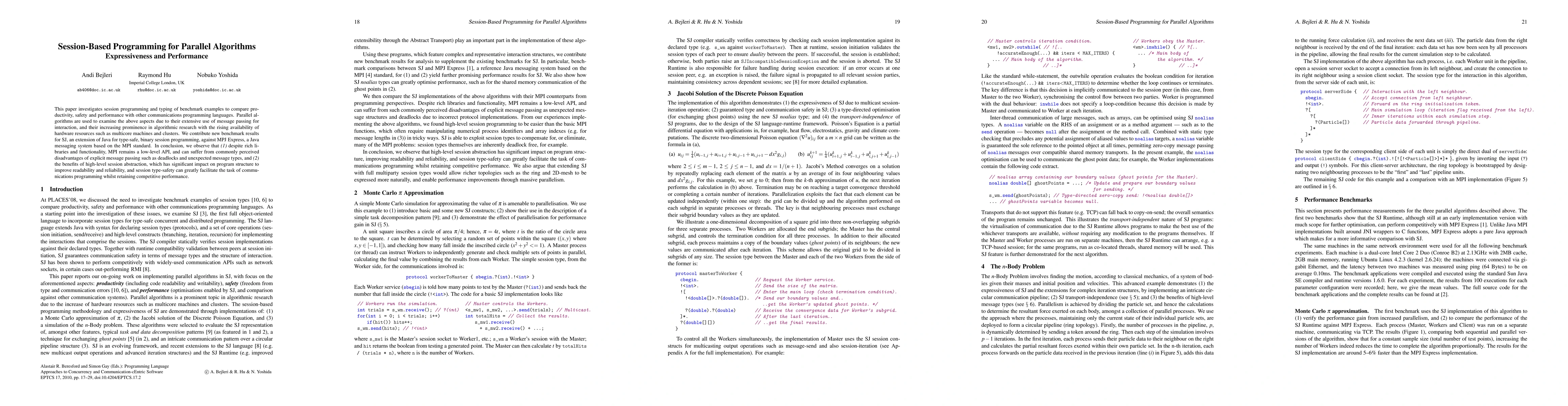 This paper investigates session programming and typing of benchmark examples to compare productivity, safety and performance with other communications programming languages. Parallel algorithms are used to examine the above aspects due to their extensive use of message passing for interaction, and their increasing prominence in algorithmic research with the rising availability of hardware resources such as multicore machines and clusters. We contribute new benchmark results for SJ, an extension of Java for type-safe, binary session programming, against MPJ Express, a Java messaging system based on the MPI standard. In conclusion, we observe that (1) despite rich libraries and functionality, MPI remains a low-level API, and can suffer from commonly perceived disadvantages of explicit message passing such as deadlocks and unexpected message types, and (2) the benefits of high-level session abstraction, which has significant impact on program structure to improve readability and reliability, and session type-safety can greatly facilitate the task of communications programming whilst retaining competitive performance.