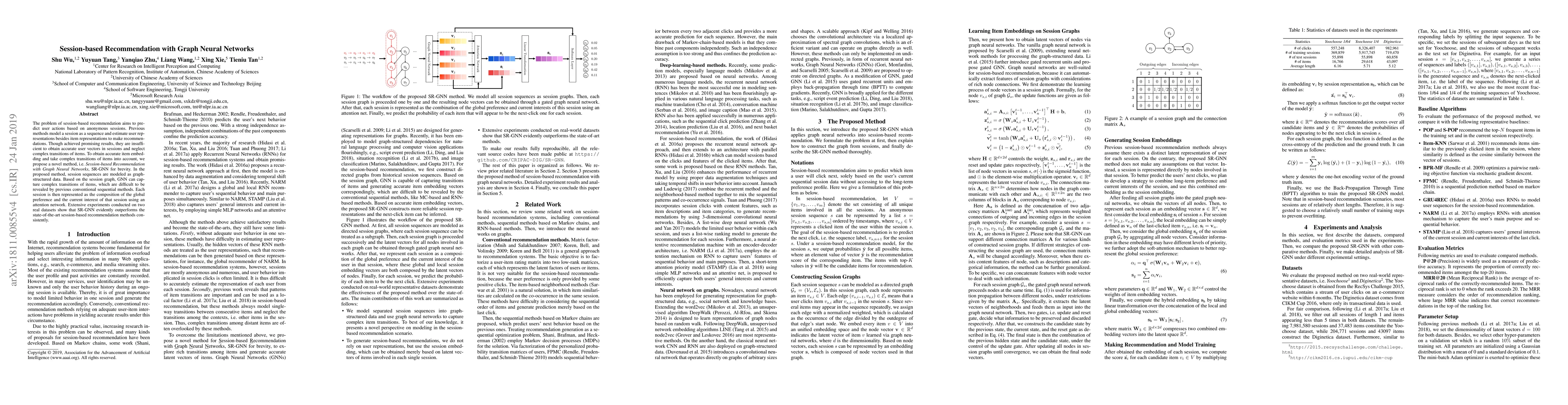 This paper proposes Session-based Recommendation with Graph Neural Networks (SR-GNN) to improve session-based recommendation by modeling session sequences as graph-structured data, enabling GNN to capture complex item transitions. SR-GNN outperforms existing methods in experiments on two datasets.