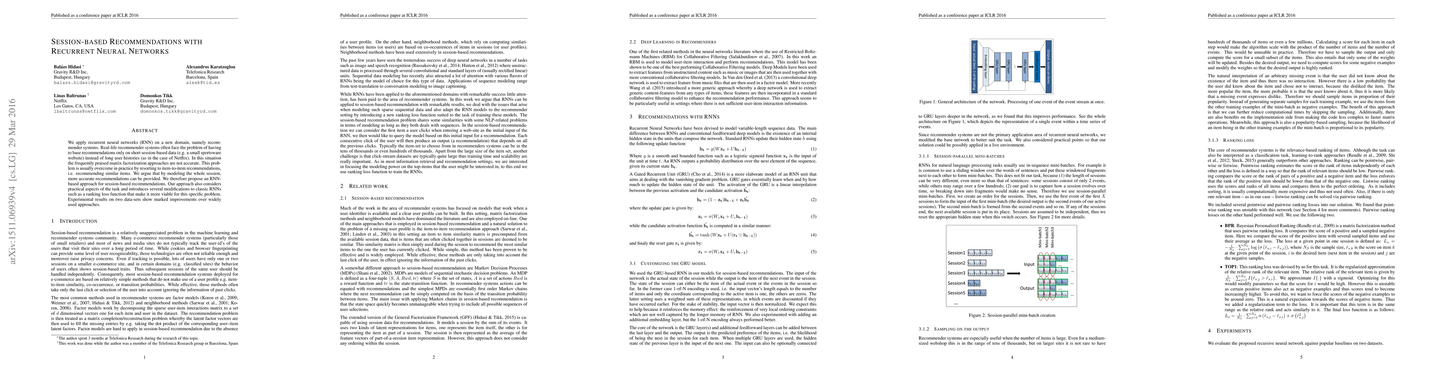 This paper proposes an RNN-based method for session-based recommendations, addressing the challenge of making accurate suggestions based on short user sessions. The RNN model incorporates practical enhancements, such as a ranking loss function, and outperforms traditional matrix factorization and item-to-item recommendation methods.