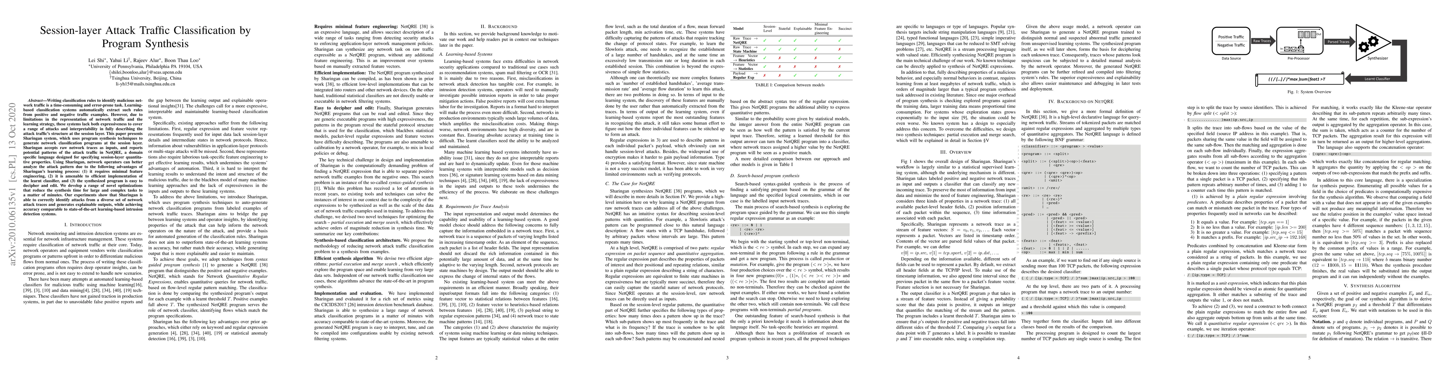 Writing classification rules to identify malicious network traffic is a time-consuming and error-prone task. Learning-based classification systems automatically extract such rules from positive and negative traffic examples. However, due to limitations in the representation of network traffic and the learning strategy, these systems lack both expressiveness to cover a range of attacks and interpretability in fully describing the attack traffic's structure at the session layer. This paper presents Sharingan system, which uses program synthesis techniques to generate network classification programs at the session layer. Sharingan accepts raw network traces as inputs, and reports potential patterns of the attack traffic in NetQRE, a domain specific language designed for specifying session-layer quantitative properties. Using Sharingan, network operators can better analyze the attack pattern due to the following advantages of Sharingan's learning process: (1) it requires minimal feature engineering, (2) it is amenable to efficient implementation of the learnt classifier, and (3) the synthesized program is easy to decipher and edit. We develop a range of novel optimizations that reduce the synthesis time for large and complex tasks to a matter of minutes. Our experiments show that Sharingan is able to correctly identify attacks from a diverse set of network attack traces and generates explainable outputs, while achieving accuracy comparable to state-of-the-art learning-based intrusion detection systems.