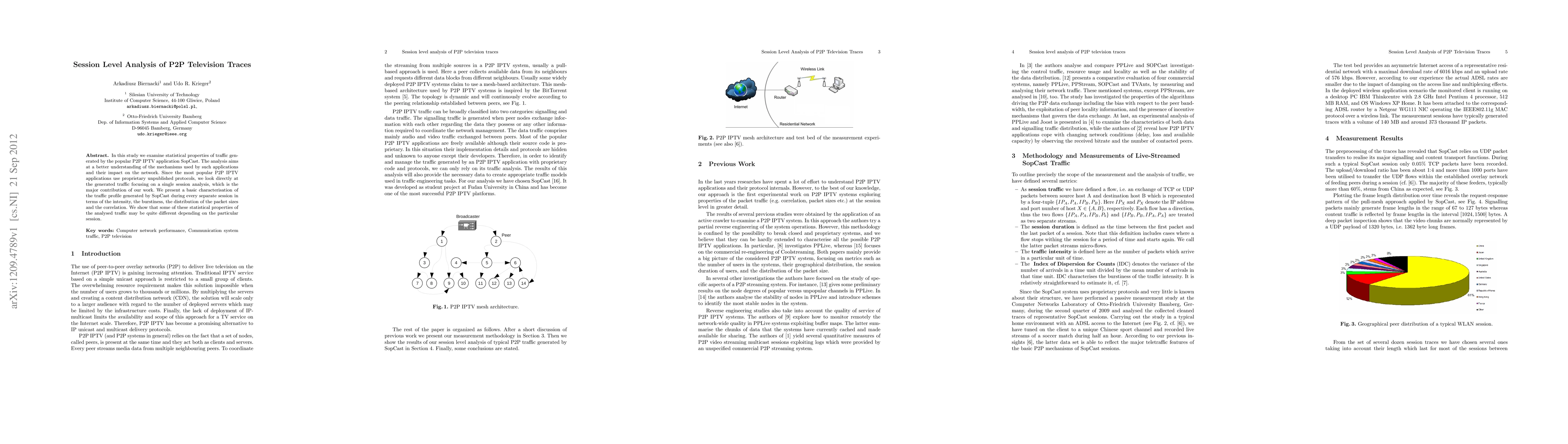 This study analyzes the statistical properties of traffic from the SopCast P2P IPTV application, focusing on session-level characteristics including intensity, burstiness, packet size distribution, and correlation. The research reveals significant variations in these properties across different sessions.