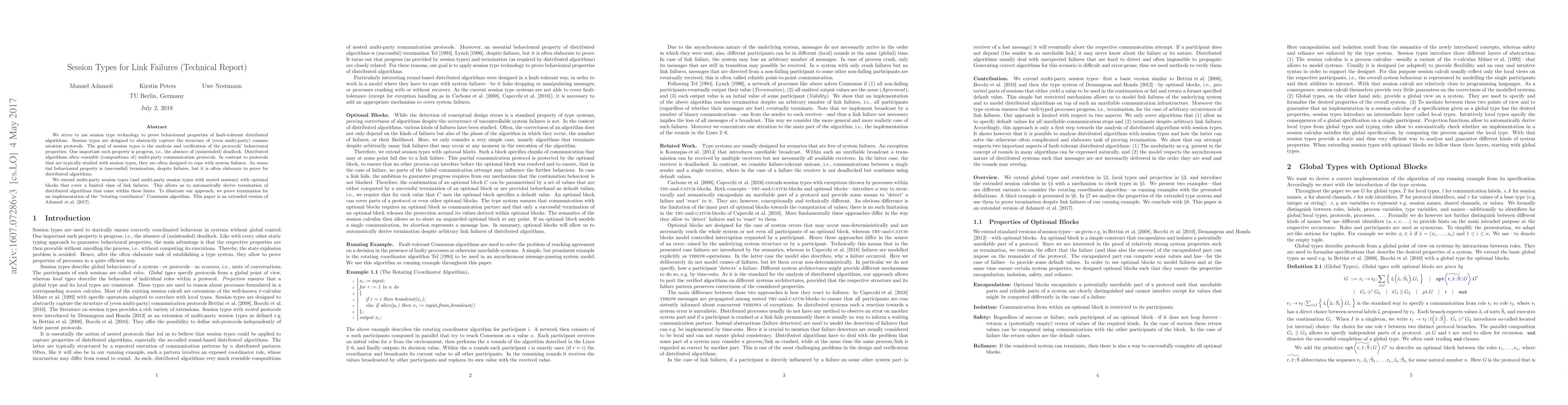 We strive to use session type technology to prove behavioural properties of fault-tolerant distributed algorithms. Session types are designed to abstractly capture the structure of (even multi-party) communication protocols. The goal of session types is the analysis and verification of the protocols' behavioural properties. One important such property is progress, i.e., the absence of (unintended) deadlock. Distributed algorithms often resemble (compositions of) multi-party communication protocols. In contrast to protocols that are typically studied with session types, they are often designed to cope with system failures. An essential behavioural property is (successful) termination, despite failures, but it is often elaborate to prove for distributed algorithms. We extend multi-party session types (and multi-party session types with nested sessions) by optional blocks that cover a limited class of link and crash failures. This allows us to automatically derive termination of distributed algorithms that come within these limits. To illustrate our approach, we prove termination for an implementation of the *rotating coordinator* Consensus algorithm.