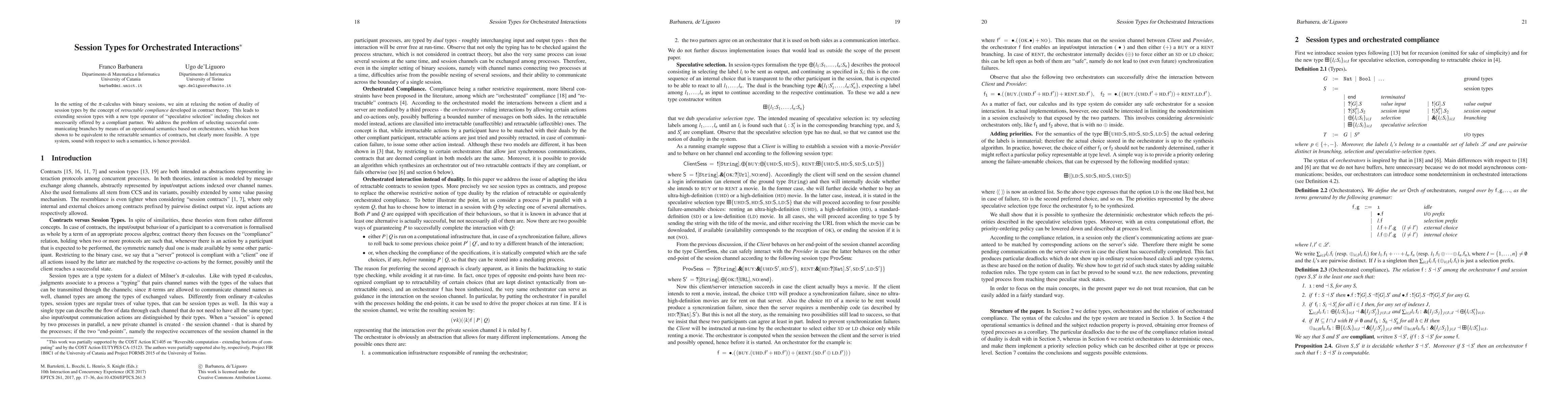 This paper extends session types in the pi-calculus with a new "speculative selection" operator to relax the notion of session type duality, incorporating retractable compliance from contract theory. It introduces an operational semantics based on orchestrators to select successful communication branches, providing a sound type system.
