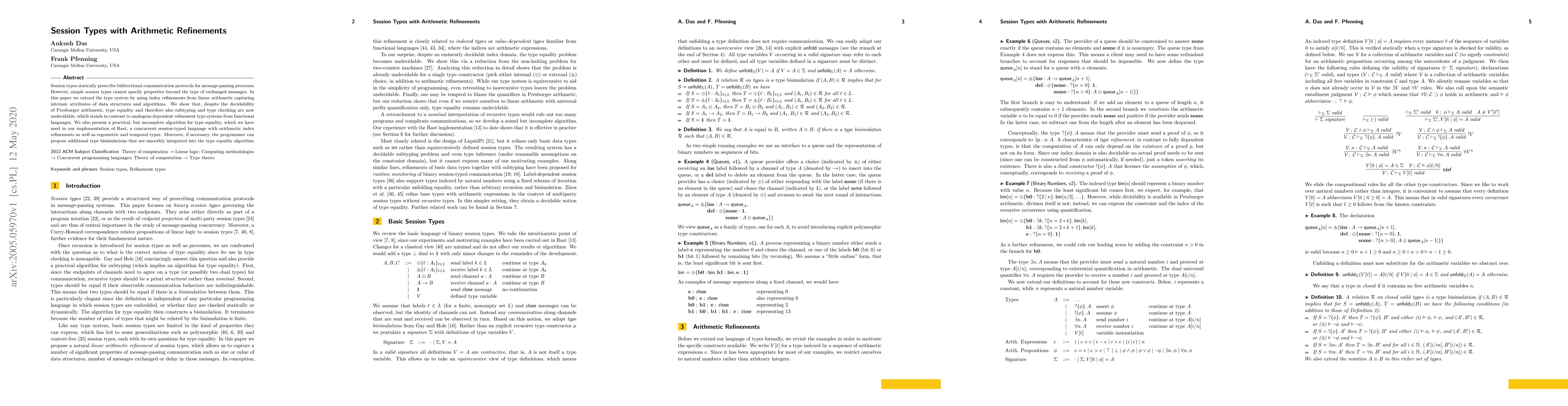 This paper extends session types by incorporating arithmetic refinements to capture intrinsic properties of data structures and algorithms. Despite the decidability of Presburger arithmetic, type equality, subtyping, and type checking become undecidable, differing from dependent refinement type systems in functional languages. A practical, albeit incomplete, algorithm for type equality is presented, and an implementation in Rast demonstrates its application.