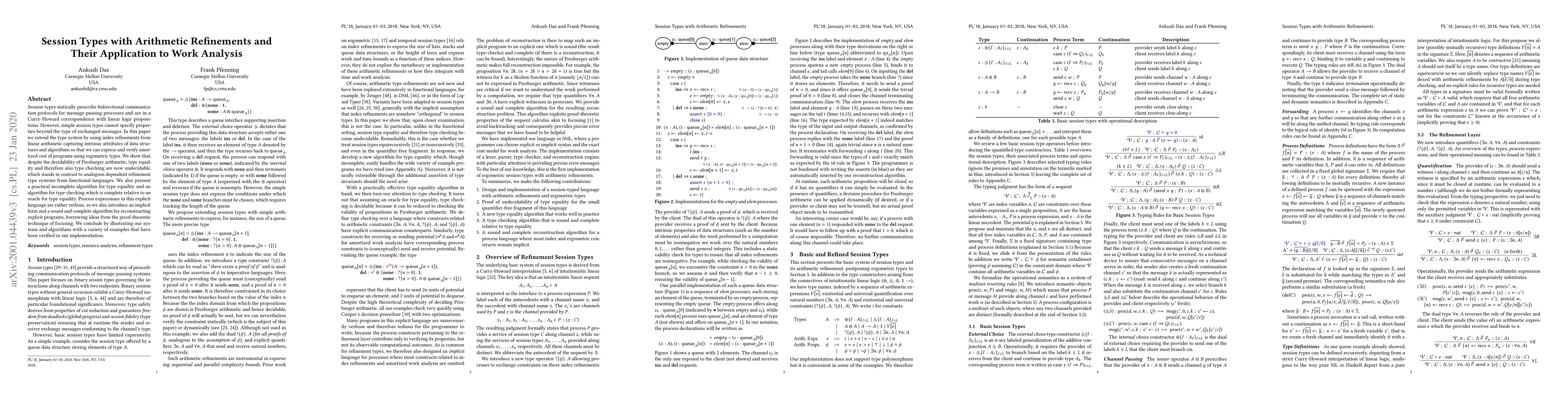 This paper extends session types with arithmetic refinements to capture data structure attributes and verify program amortized costs, but finds type equality and checking to be undecidable due to the use of Presburger arithmetic. It proposes a practical incomplete algorithm for type equality and a complete type checking algorithm relative to a type equality oracle, along with an implicit form for concise process expressions.