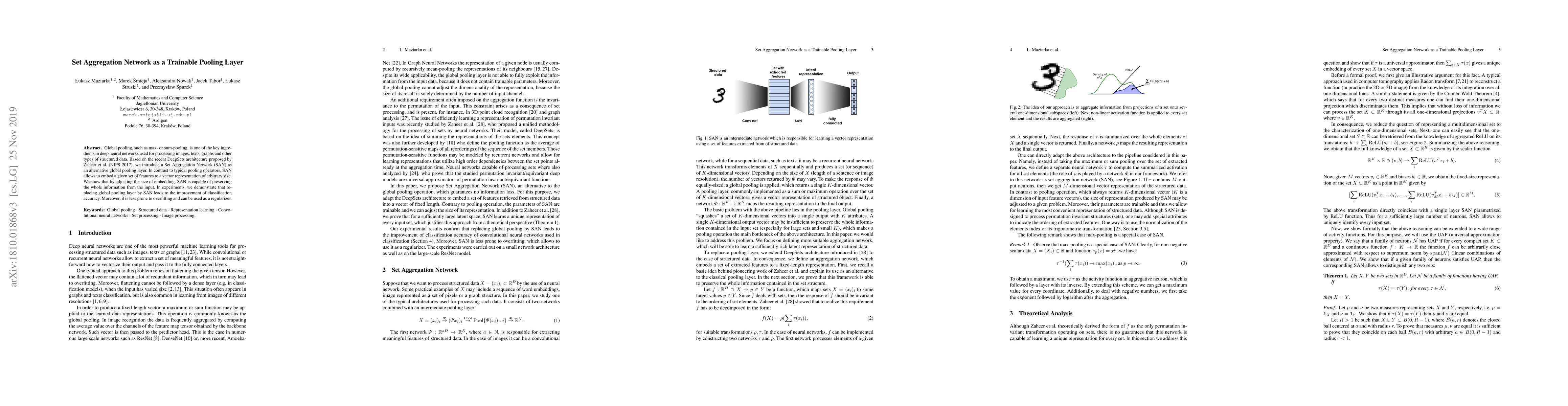 The paper proposes a Set Aggregation Network (SAN) as an alternative global pooling layer, which can embed sets of features to vector representations of arbitrary sizes, preserving input information. Experiments show that SAN improves classification accuracy and reduces overfitting compared to traditional pooling methods.
