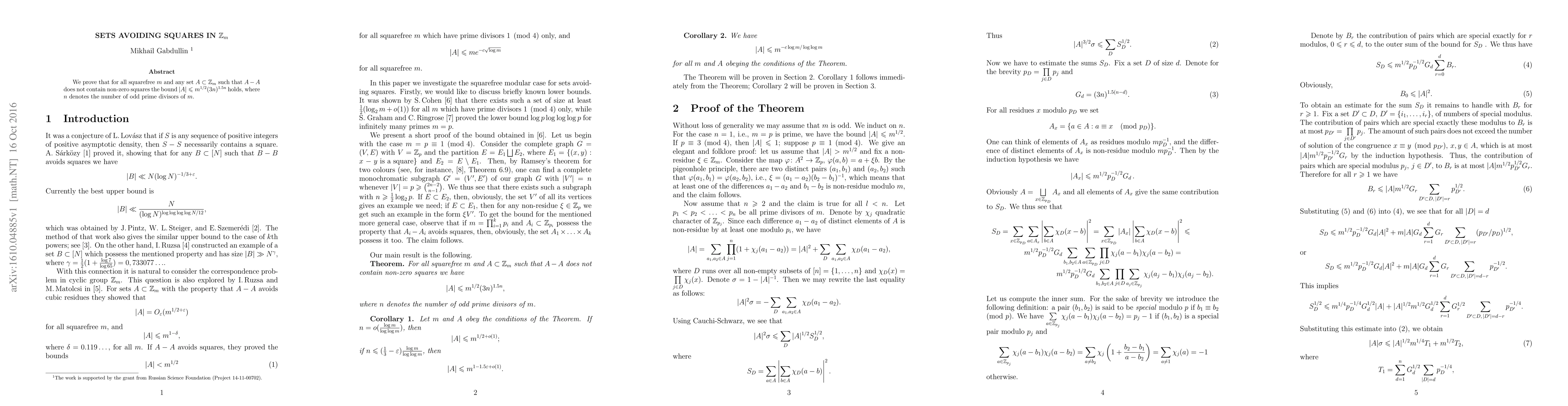The paper proves a bound on the size of a set in Z_m that avoids squares, with the bound being m^(1/2)*(3n)^(1.5n), where n is the number of odd prime divisors of m.