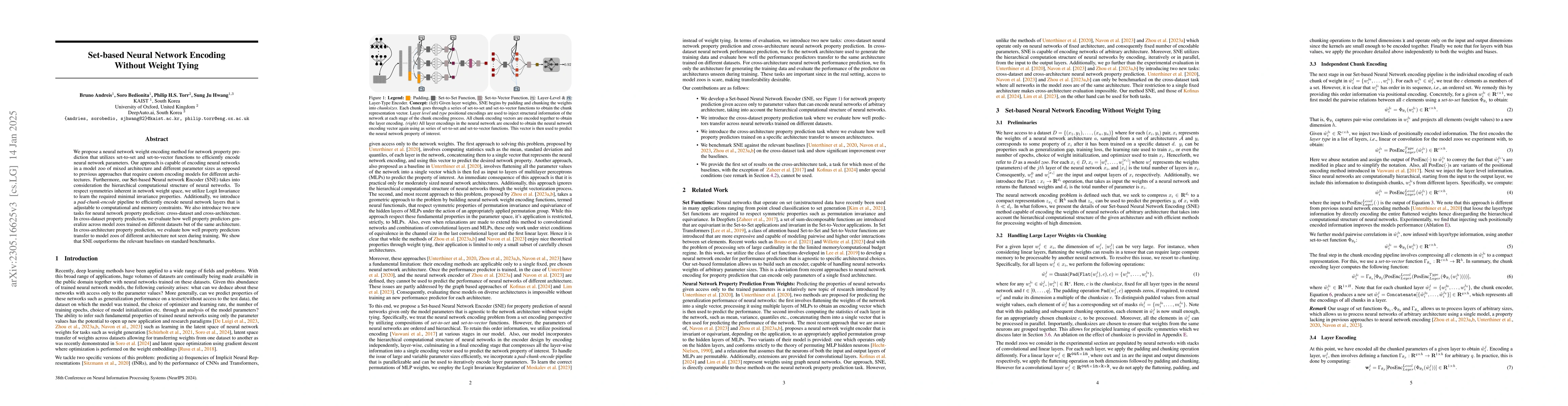 The paper proposes a set-based neural network encoder (SNE) for efficient weight encoding and generalization performance prediction, capable of handling diverse architectures and parameter sizes. SNE employs a layer-wise encoding scheme and a pad-chunk-encode pipeline, and it outperforms baselines in cross-dataset performance prediction, with initial results on cross-architecture performance prediction.