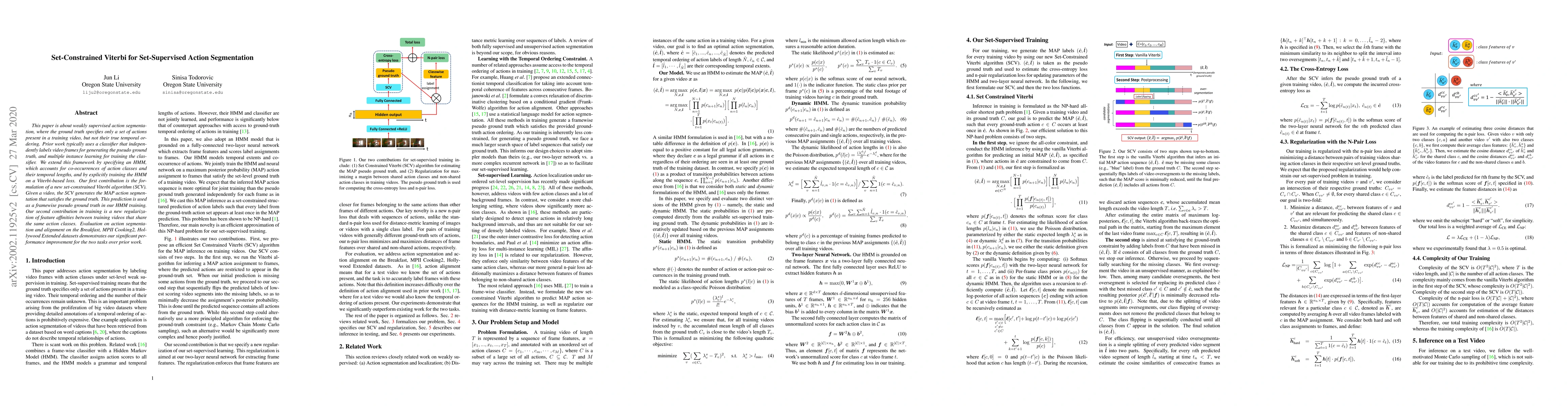 This paper proposes a set-constrained Viterbi algorithm for weakly supervised action segmentation, improving HMM training with pseudo ground truth and regularization of feature affinities. Evaluation shows significant performance gains over prior methods on multiple datasets.