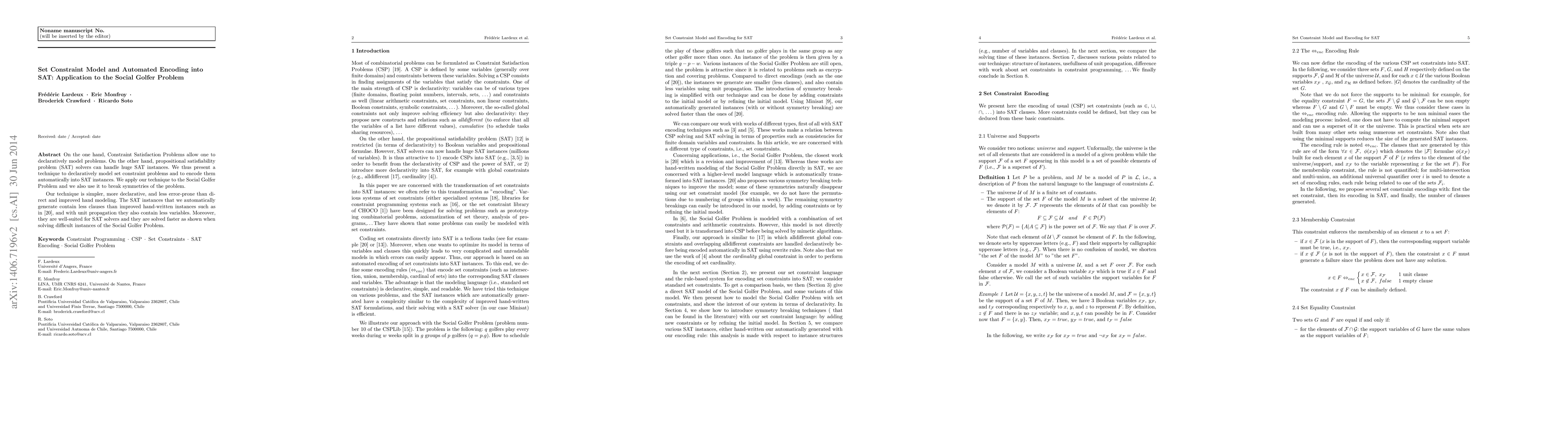 This paper presents a method to model set constraint problems declaratively and automatically encode them into SAT instances, applying it to the Social Golfer Problem. The technique is more declarative and efficient than manual modeling, generating SAT instances with fewer clauses and variables, and solving them faster.