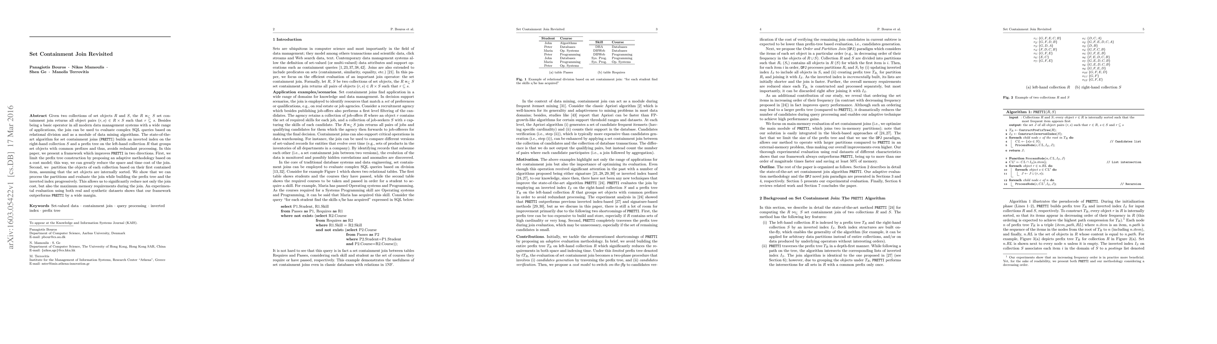 This paper proposes a framework to improve the PRETTI algorithm for set containment joins by adaptively limiting prefix tree construction and partitioning objects based on their first contained item, which significantly reduces join cost and memory requirements. Experimental results show substantial performance gains over the original PRETTI algorithm.
