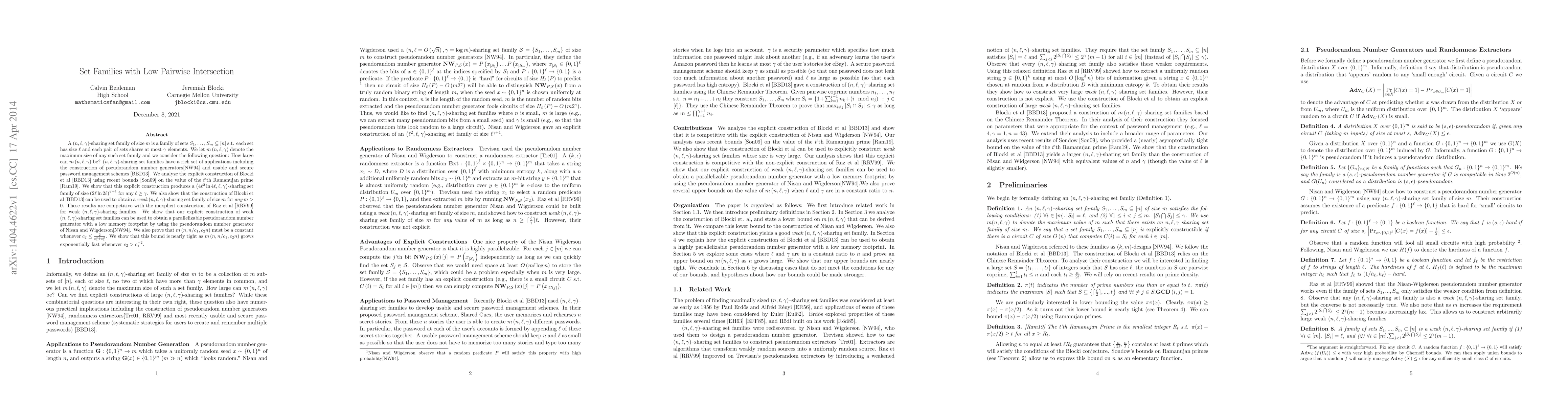 A $\left(n,\ell,\gamma\right)$-sharing set family of size $m$ is a family of sets $S_1,\ldots,S_m\subseteq [n]$ s.t. each set has size $\ell$ and each pair of sets shares at most $\gamma$ elements. We let $m\left(n,\ell,\gamma\right)$ denote the maximum size of any such set family and we consider the following question: How large can $m\left(n,\ell,\gamma\right)$ be? $\left(n,\ell,\gamma\right)$-sharing set families have a rich set of applications including the construction of pseudorandom number generators and usable and secure password management schemes. We analyze the explicit construction of Blocki et al using recent bounds on the value of the $t$'th Ramanujan prime. We show that this explicit construction produces a $\left(4\ell^2\ln 4\ell,\ell,\gamma\right)$-sharing set family of size $\left(2 \ell \ln 2\ell\right)^{\gamma+1}$ for any $\ell\geq \gamma$. We also show that the construction of Blocki et al can be used to obtain a weak $\left(n,\ell,\gamma\right)$-sharing set family of size $m$ for any $m >0$. These results are competitive with the inexplicit construction of Raz et al for weak $\left(n,\ell,\gamma\right)$-sharing families. We show that our explicit construction of weak $\left(n,\ell,\gamma\right)$-sharing set families can be used to obtain a parallelizable pseudorandom number generator with a low memory footprint by using the pseudorandom number generator of Nisan and Wigderson. We also prove that $m\left(n,n/c_1,c_2n\right)$ must be a constant whenever $c_2 \leq \frac{2}{c_1^3+c_1^2}$. We show that this bound is nearly tight as $m\left(n,n/c_1,c_2n\right)$ grows exponentially fast whenever $c_2 > c_1^{-2}$.