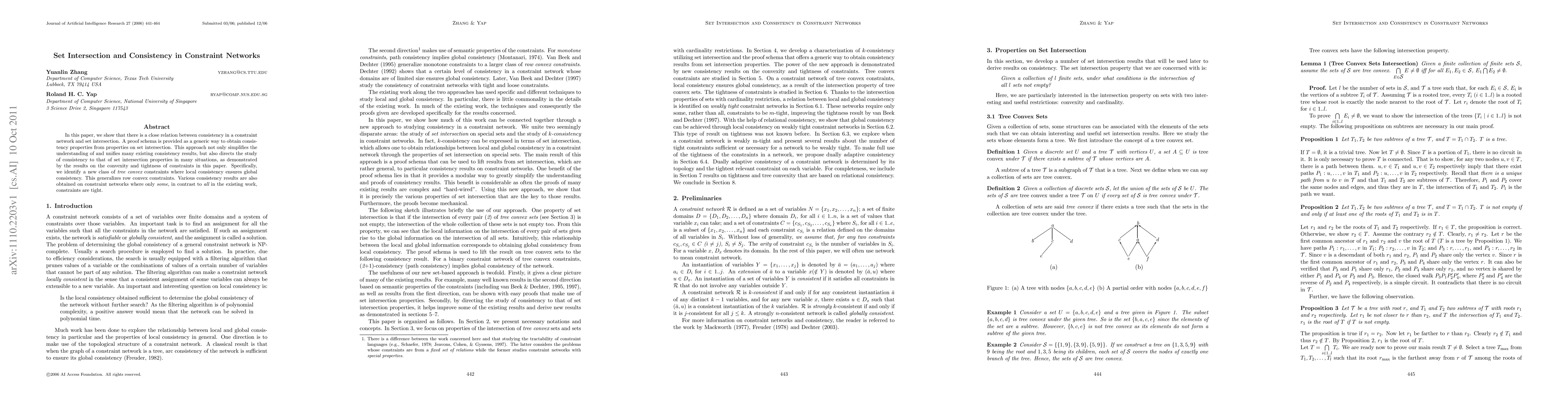 The paper shows a connection between consistency in constraint networks and set intersection, revealing new insights into tree convex constraints and local consistency ensuring global consistency.