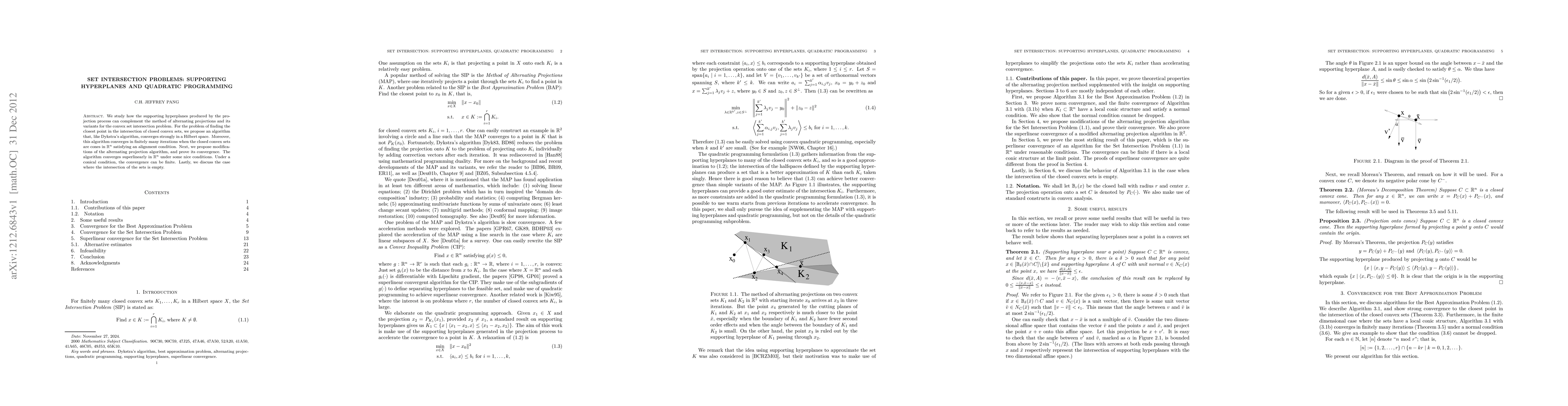 This paper explores the use of supporting hyperplanes to enhance the method of alternating projections for solving convex set intersection problems. It proposes an algorithm that converges strongly and finitely under specific conditions, and modifies the alternating projection algorithm to achieve superlinear convergence, with potential for finite convergence under conical conditions.