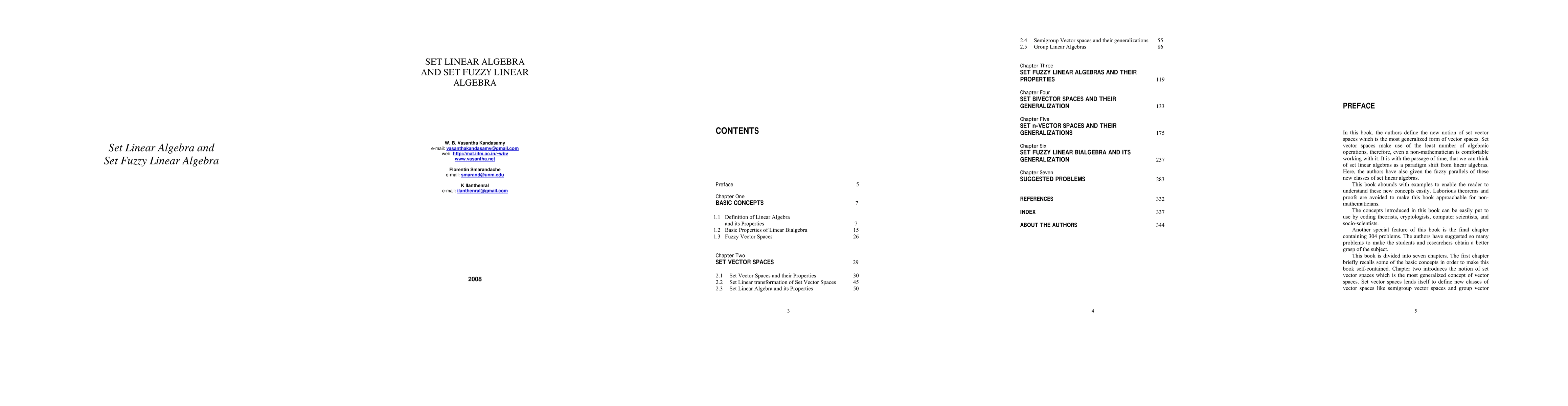 In this book, the authors define the new notion of set vector spaces which is the most generalized form of vector spaces. Set vector spaces make use of the least number of algebraic operations, therefore, even a non-mathematician is comfortable working with it. It is with the passage of time, that we can think of set linear algebras as a paradigm shift from linear algebras. Here, the authors have also given the fuzzy parallels of these new classes of set linear algebras. This book is divided into seven chapters. The first chapter briefly recalls some of the basic concepts in order to make this book self-contained. Chapter two introduces the notion of set vector spaces which is the most generalized concept of vector spaces. Set vector spaces lends itself to define new classes of vector spaces like semigroup vector spaces and group vector spaces. These are also generalization of vector spaces. The fuzzy analogue of these concepts are given in Chapter three. In Chapter four, set vector spaces are generalized to biset bivector spaces and not set vector spaces. This is done taking into account the advanced information technology age in which we live. As mathematicians, we have to realize that our computer-dominated world needs special types of sets and algebraic structures. Set n-vector spaces and their generalizations are carried out in Chapter five. Fuzzy n-set vector spaces are introduced in the sixth chapter. The seventh chapter suggests more than three hundred problems.