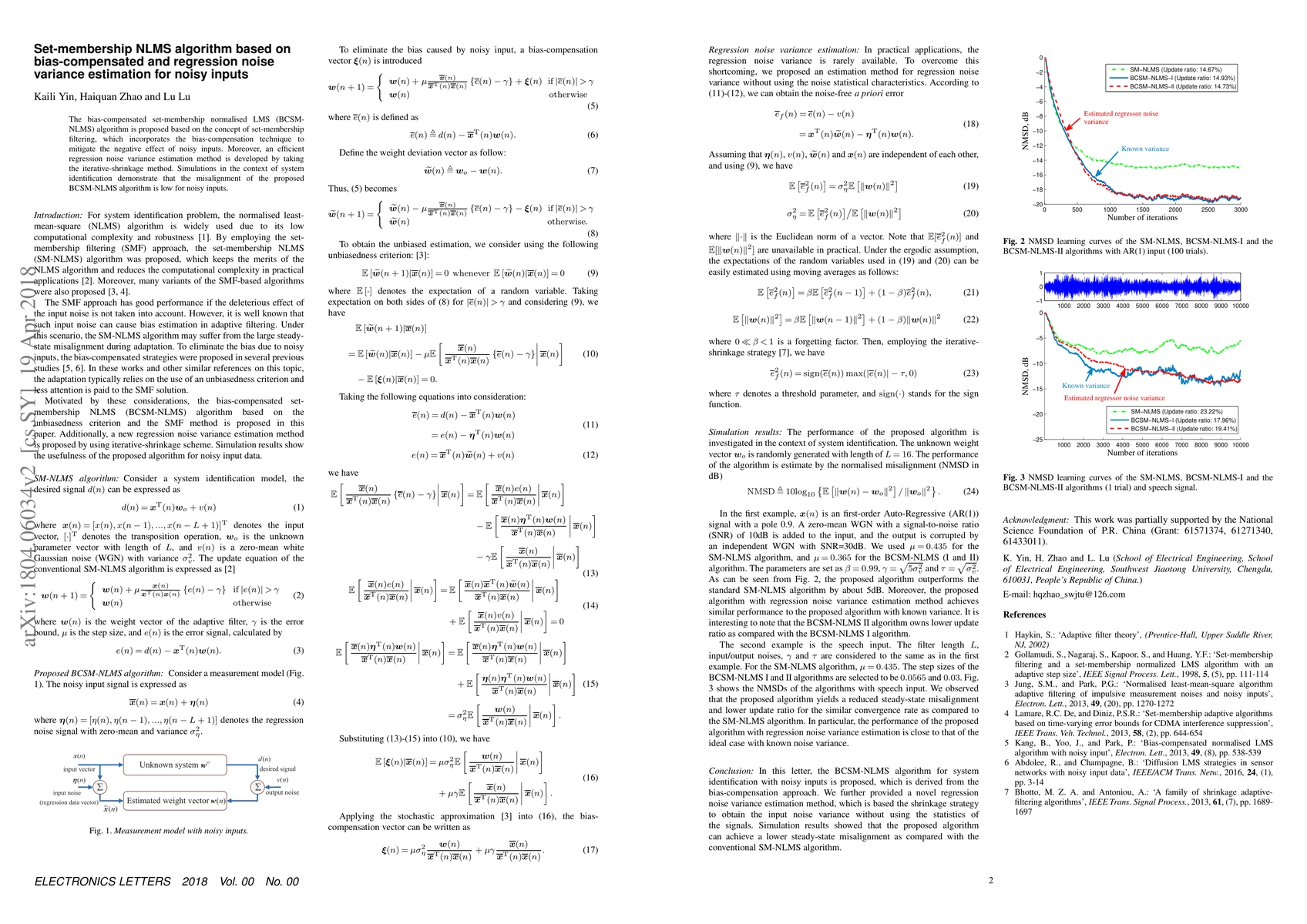 The BCSM-NLMS algorithm incorporates bias compensation and regression noise variance estimation to improve performance under noisy conditions. Simulation results show it effectively reduces misalignment in system identification tasks.