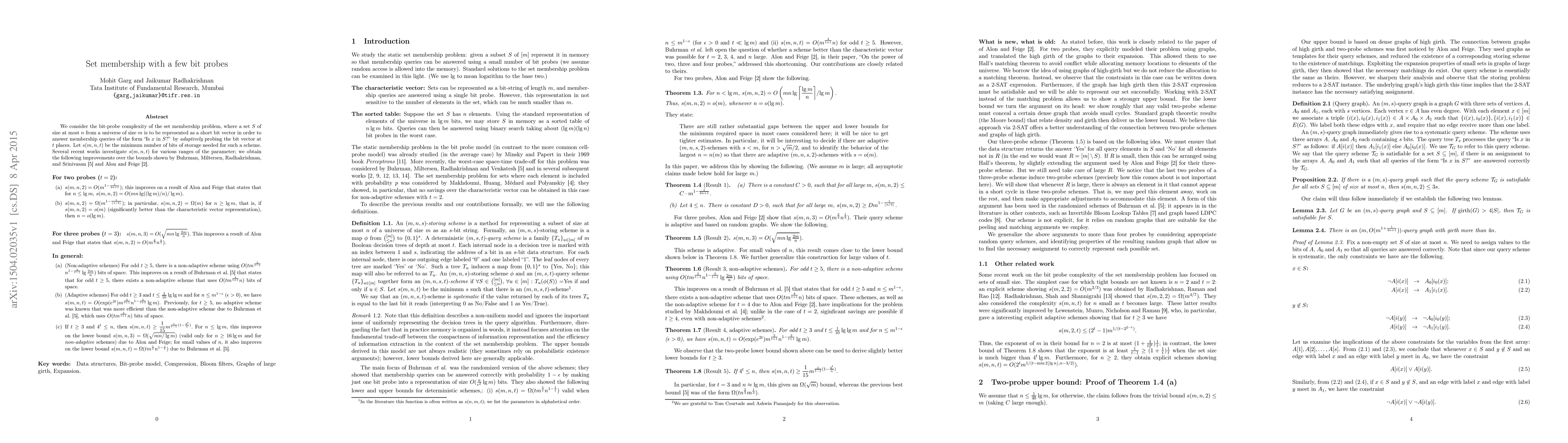 We consider the bit-probe complexity of the set membership problem, where a set S of size at most n from a universe of size m is to be represented as a short bit vector in order to answer membership queries of the form "Is x in S?" by adaptively probing the bit vector at t places. Let s(m,n,t) be the minimum number of bits of storage needed for such a scheme. Several recent works investigate s(m,n,t) for various ranges of the parameter; we obtain improvements over some of the bounds shown by Buhrman, Miltersen, Radhakrishnan, and Srinivasan (2002) and Alon and Feige (2009).