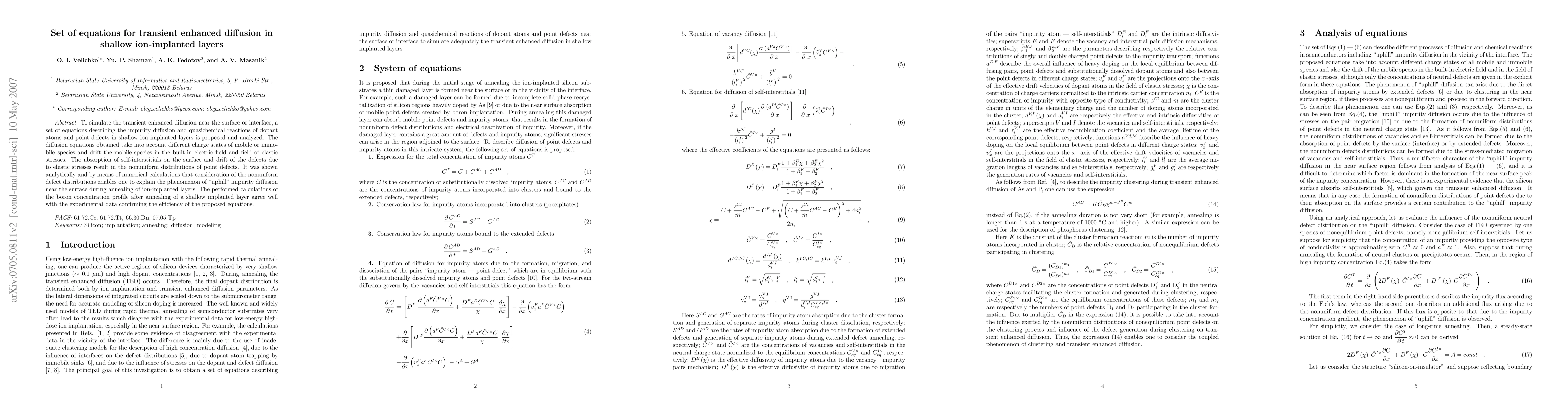 This paper proposes a set of equations to simulate transient enhanced diffusion in ion-implanted layers, accounting for impurity diffusion and quasichemical reactions. The model explains "uphill" impurity diffusion during annealing, and calculations match experimental boron concentration profiles.
