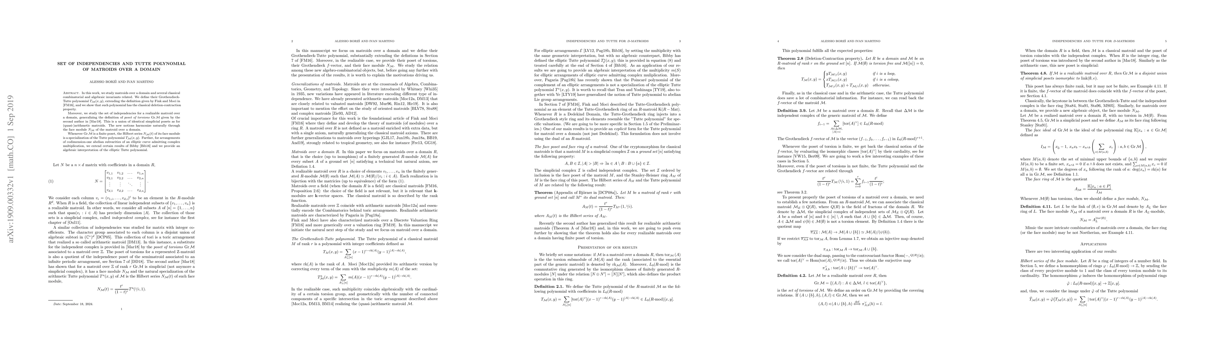 This paper extends the definition of the Grothendieck-Tutte polynomial for matroids over a domain, proving its deletion-contraction property. It also generalizes the notion of poset of torsions and explores the set of independencies, linking these through the matroid's face module, with the Hilbert series of the face module being a specialization of the Tutte polynomial.