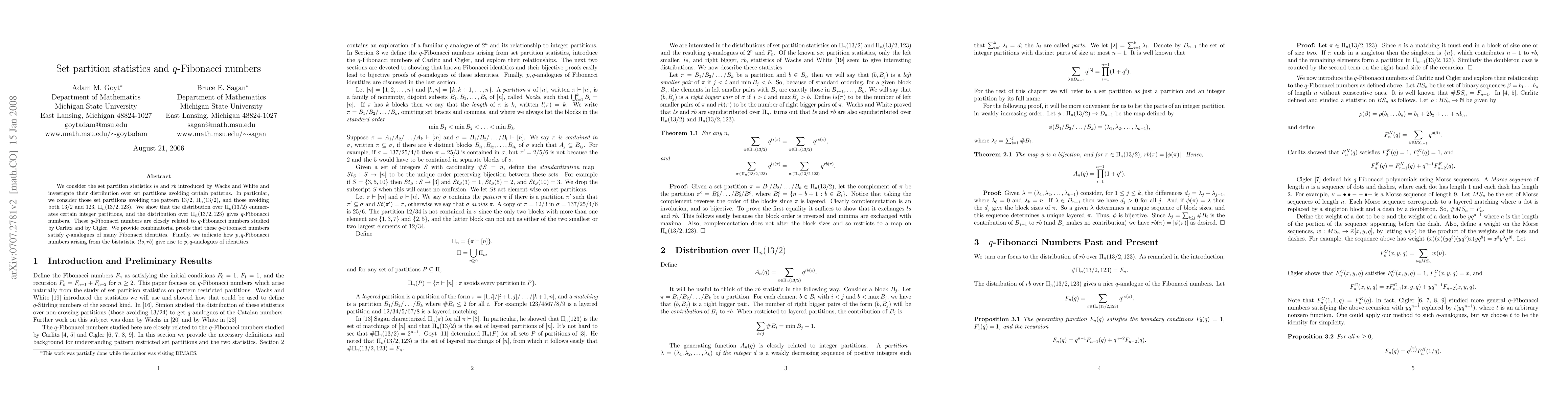 The research investigates set partition statistics and their distribution over partitions avoiding specific patterns, specifically focusing on 13/2 and 123 patterns. Combinatorial proofs are provided for q-Fibonacci identities.