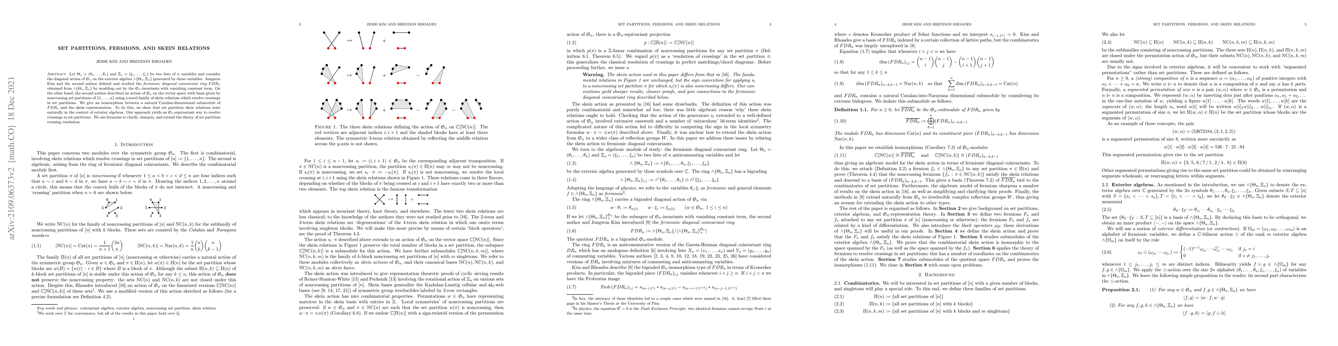 Let $\Theta_n = (\theta_1, \dots, \theta_n)$ and $\Xi_n = (\xi_1, \dots, \xi_n)$ be two lists of $n$ variables and consider the diagonal action of $\mathfrak{S}_n$ on the exterior algebra $\wedge \{ \Theta_n, \Xi_n \}$ generated by these variables. Jongwon Kim and the second author defined and studied the fermionic diagonal coinvariant ring $FDR_n$ obtained from $\wedge \{ \Theta_n, \Xi_n \}$ by modding out by the $\mathfrak{S}_n$-invariants with vanishing constant term. On the other hand, the second author described an action of $\mathfrak{S}_n$ on the vector space with basis given by noncrossing set partitions of $\{1,\dots,n\}$ using a novel family of skein relations which resolve crossings in set partitions. We give an isomorphism between a natural Catalan-dimensional submodule of $FDR_n$ and the skein representation. To do this, we show that set partition skein relations arise naturally in the context of exterior algebras. Our approach yields an $\mathfrak{S}_n$-equivariant way to resolve crossings in set partitions. We use fermions to clarify, sharpen, and extend the theory of set partition crossing resolution.