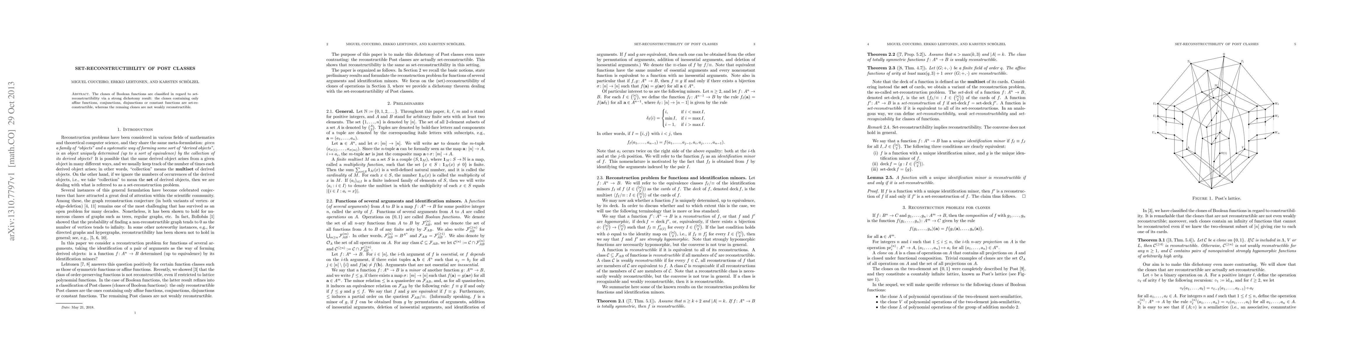 The clones of Boolean functions are classified in regard to set-reconstructibility via a strong dichotomy result: the clones containing only affine functions, conjunctions, disjunctions or constant functions are set-reconstructible, whereas the remaing clones are not weakly reconstructible.