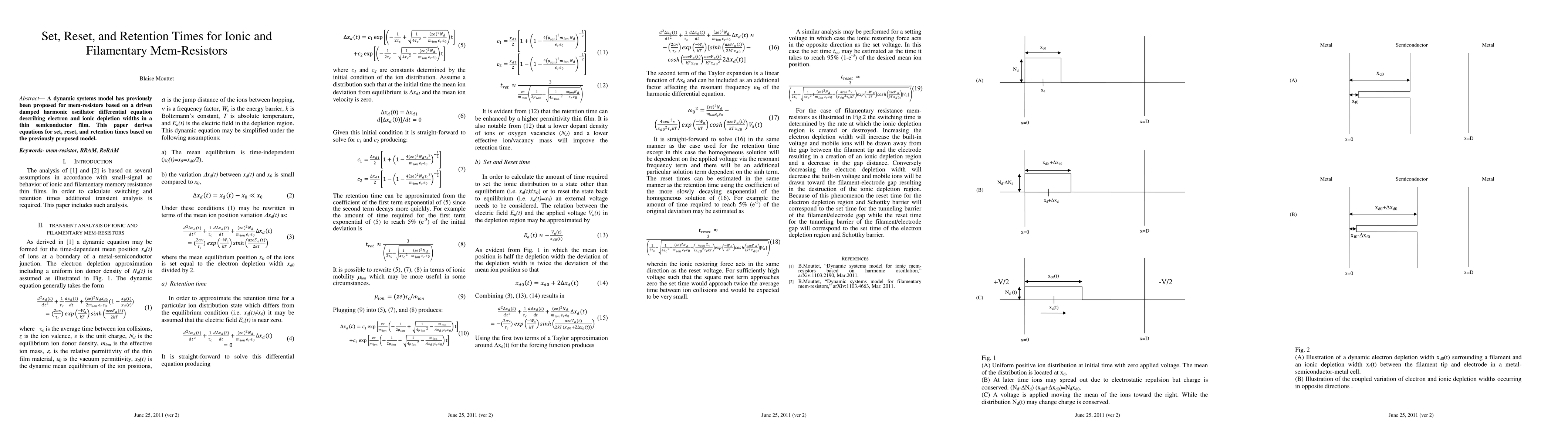 This paper derives equations for set, reset, and retention times for mem-resistors using a dynamic systems model based on a driven damped harmonic oscillator, focusing on electron and ionic depletion widths in thin semiconductor films. Keywords include mem-resistor, RRAM, and ReRAM.