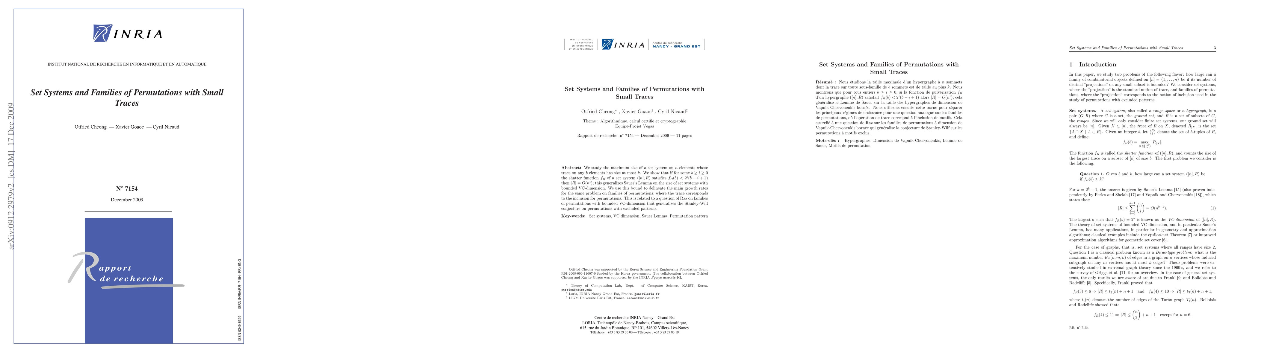 This paper studies set systems with bounded trace size, showing that a large set system can have at most O(n^i) elements if its shatter function has a certain growth rate, with implications for permutations with excluded patterns.