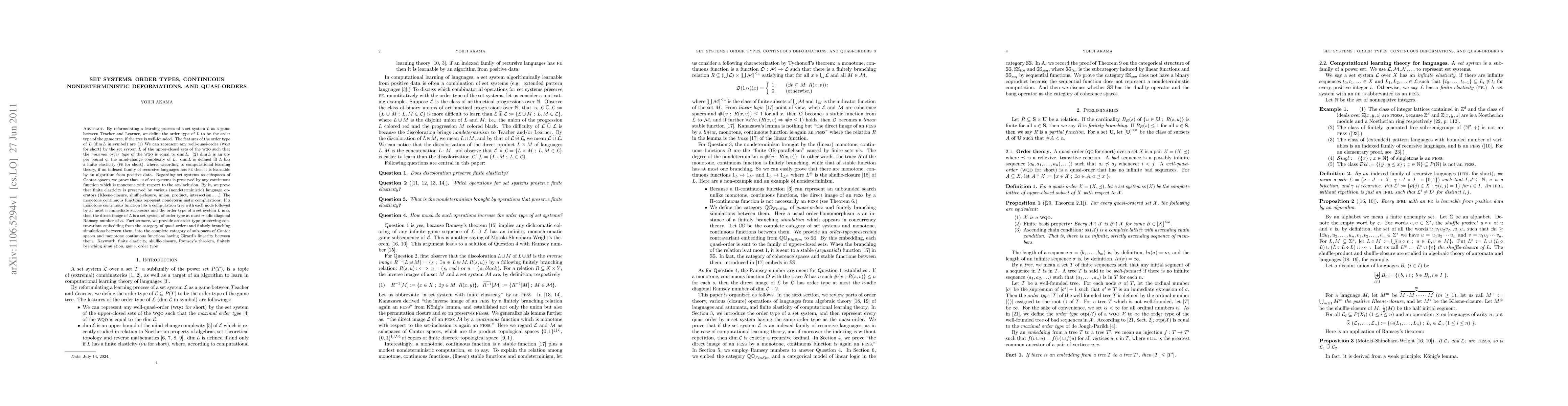 By reformulating a learning process of a set system L as a game between Teacher and Learner, we define the order type of L to be the order type of the game tree, if the tree is well-founded. The features of the order type of L (dim L in symbol) are (1) We can represent any well-quasi-order (wqo for short) by the set system L of the upper-closed sets of the wqo such that the maximal order type of the wqo is equal to dim L. (2) dim L is an upper bound of the mind-change complexity of L. dim L is defined iff L has a finite elasticity (fe for short), where, according to computational learning theory, if an indexed family of recursive languages has fe then it is learnable by an algorithm from positive data. Regarding set systems as subspaces of Cantor spaces, we prove that fe of set systems is preserved by any continuous function which is monotone with respect to the set-inclusion. By it, we prove that finite elasticity is preserved by various (nondeterministic) language operators (Kleene-closure, shuffle-closure, union, product, intersection,. . ..) The monotone continuous functions represent nondeterministic computations. If a monotone continuous function has a computation tree with each node followed by at most n immediate successors and the order type of a set system L is {\alpha}, then the direct image of L is a set system of order type at most n-adic diagonal Ramsey number of {\alpha}. Furthermore, we provide an order-type-preserving contravariant embedding from the category of quasi-orders and finitely branching simulations between them, into the complete category of subspaces of Cantor spaces and monotone continuous functions having Girard's linearity between them. Keyword: finite elasticity, shuffle-closure