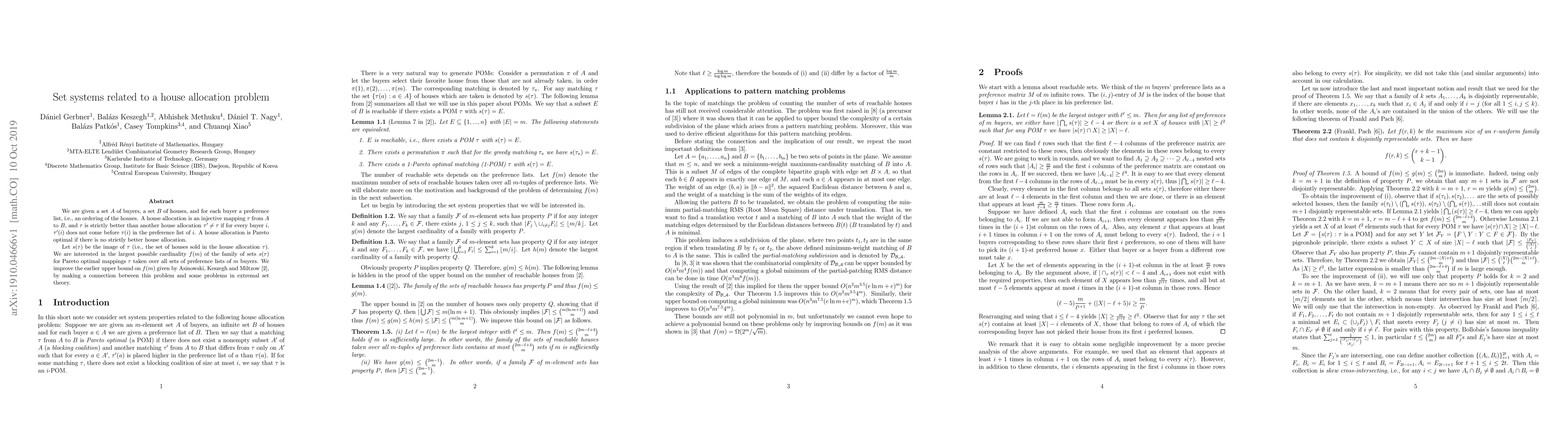 This research paper enhances the upper bound for the function f(m), which represents the maximum size of a family of sets derived from Pareto optimal house allocations in a set allocation problem. The improvement is achieved by linking this problem to certain issues in extremal set theory.
