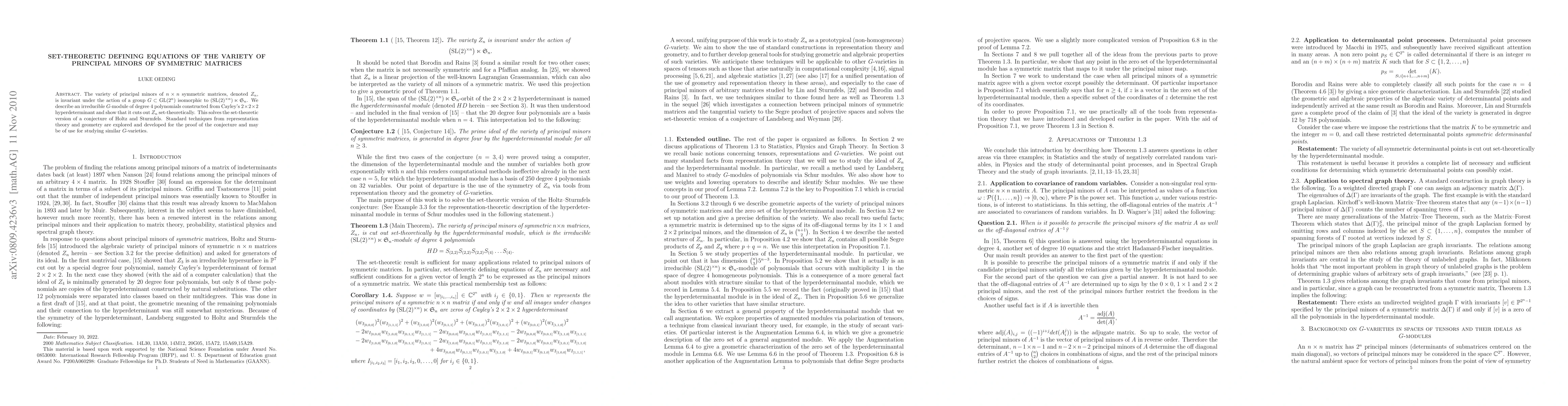 The variety of principal minors of $n\times n$ symmetric matrices, denoted $Z_{n}$, is invariant under the action of a group $G\subset \GL(2^{n})$ isomorphic to $\G$. We describe an irreducible $G$-module of degree $4$ polynomials constructed from Cayley's $2 \times 2 \times 2$ hyperdeterminant and show that it cuts out $Z_{n}$ set-theoretically. This solves the set-theoretic version of a conjecture of Holtz and Sturmfels. Standard techniques from representation theory and geometry are explored and developed for the proof of the conjecture and may be of use for studying similar $G$-varieties.