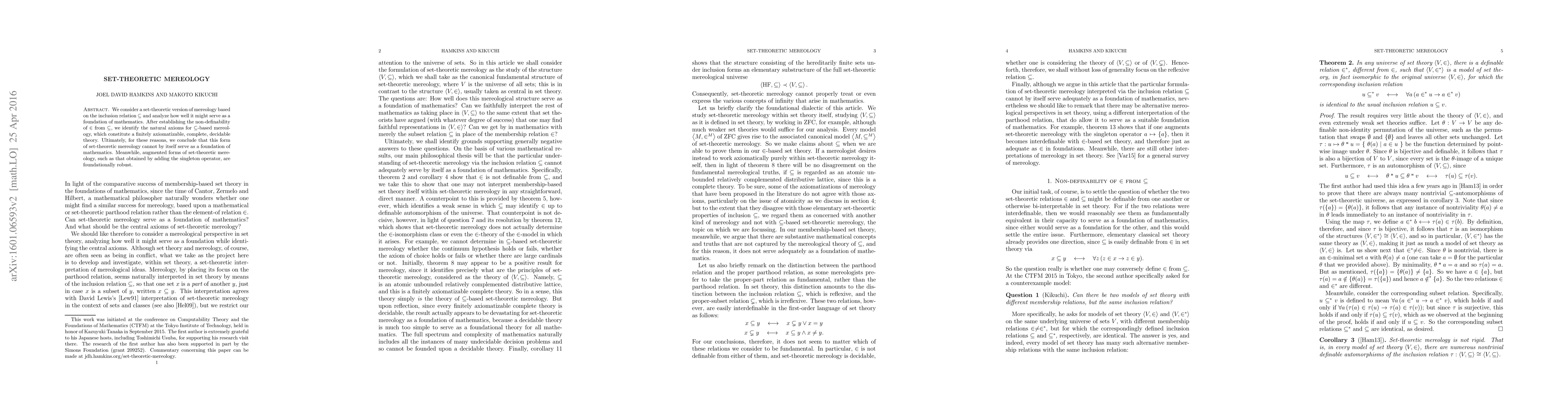 This paper explores set-theoretic mereology based on the inclusion relation, finding it finitely axiomatizable and complete but unable to serve as a standalone foundation for mathematics due to the non-definability of $\in$. Augmented versions with additional operators, like the singleton operator, show potential foundationally robust properties.