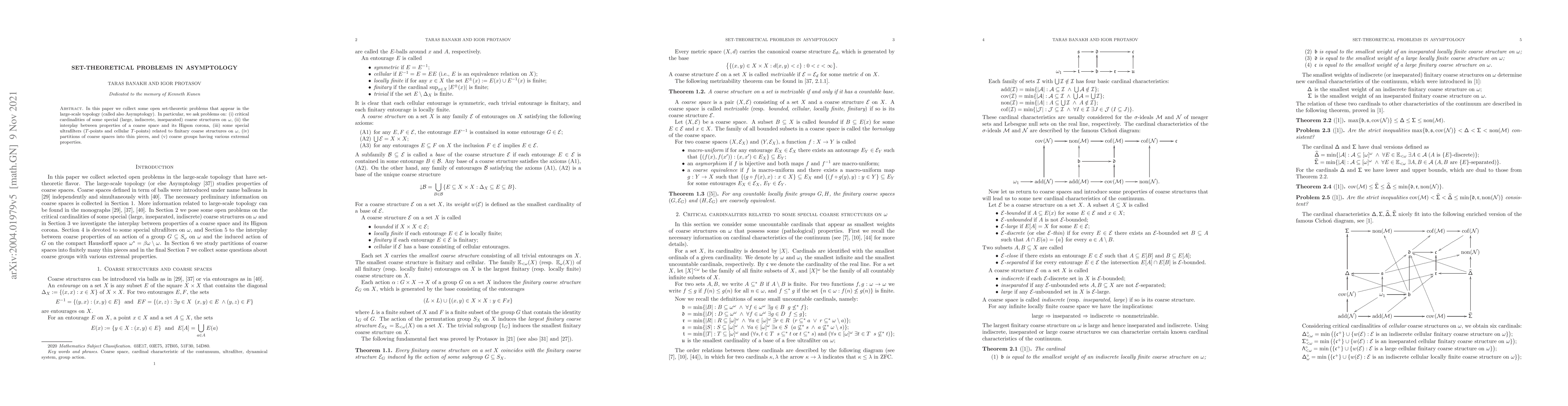 In this paper we collect some open set-theoretic problems that appear in the large-scale topology (called also Asymptology). In particular we ask problems about critical cardinalities of some special (large, indiscrete, inseparated) coarse structures on $\omega$, about the interplay between properties of a coarse space and its Higson corona, about some special ultrafilters ($T$-points and cellular $T$-points) related to finitary coarse structures on $\omega$, about partitions of coarse spaces into thin pieces, and also about coarse groups having some extremal properties.