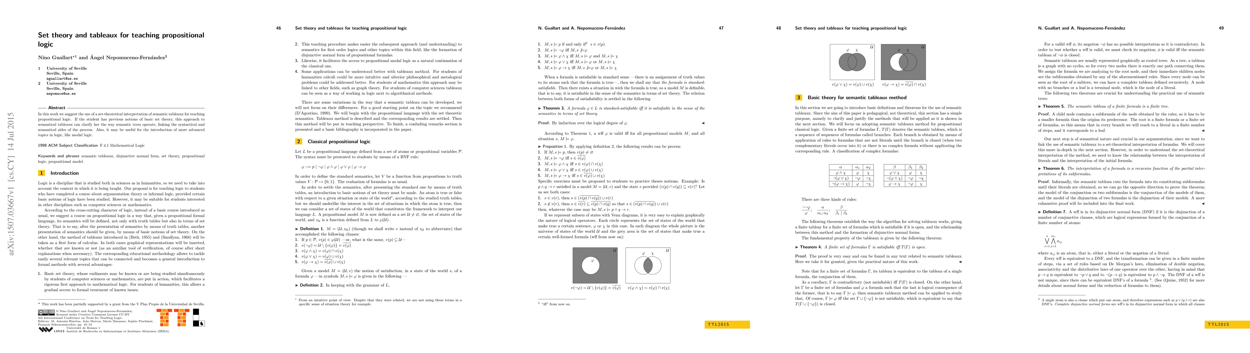 This paper proposes using set-theoretical interpretations of semantic tableaux to teach propositional logic, leveraging students' prior knowledge of basic set theory to clarify how semantic trees function, bridging syntax and semantics, and potentially introducing advanced topics like modal logic.