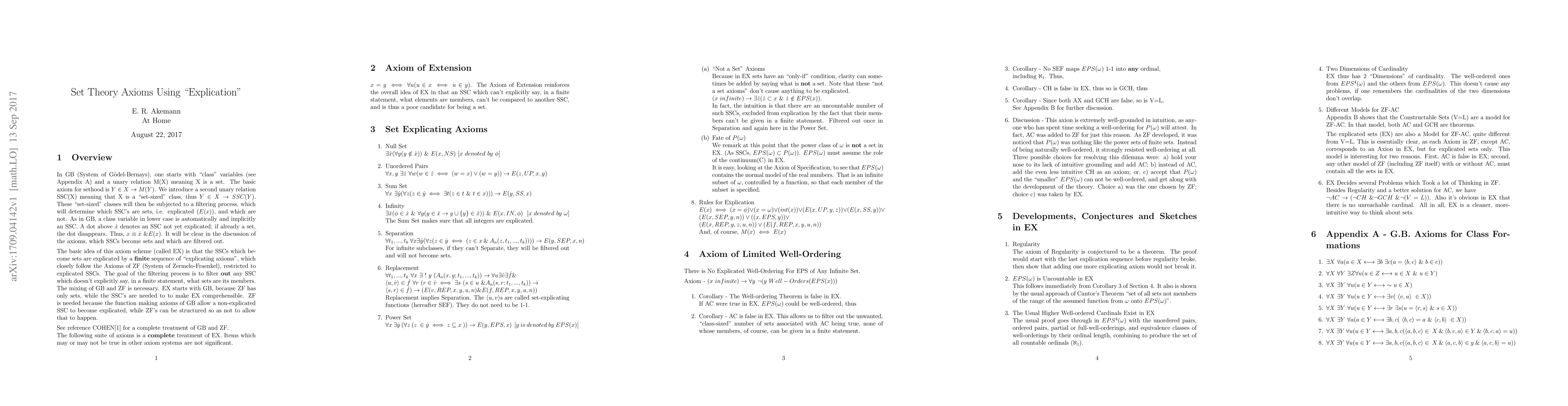 This paper provides a complete suite of axioms for a version of set theory that I call Explication. Explication borrows from the two most prominent existing systems of set theory. Explication starts with class variables. After several steps, some of these class variables are identified as sets. The most crucial step is to identify classes which can explicitly say, in a finite statement, which other classes are its members. The reader is cautioned that the suite of axioms presented is a complete treatment of Explication. Statements which may or may not be true in other axiom systems are not significant.