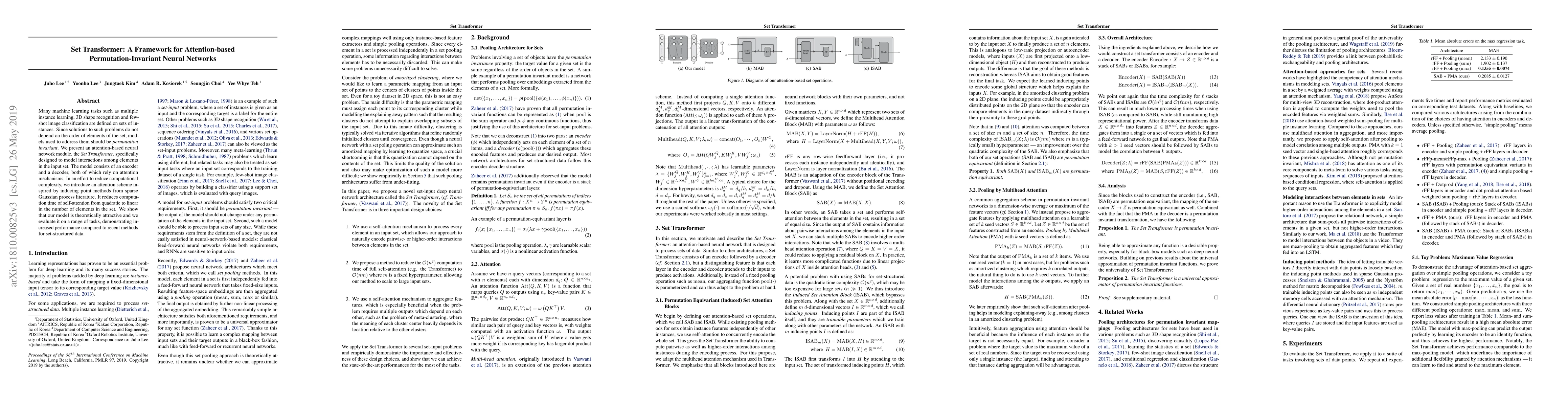 Many machine learning tasks such as multiple instance learning, 3D shape recognition, and few-shot image classification are defined on sets of instances. Since solutions to such problems do not depend on the order of elements of the set, models used to address them should be permutation invariant. We present an attention-based neural network module, the Set Transformer, specifically designed to model interactions among elements in the input set. The model consists of an encoder and a decoder, both of which rely on attention mechanisms. In an effort to reduce computational complexity, we introduce an attention scheme inspired by inducing point methods from sparse Gaussian process literature. It reduces the computation time of self-attention from quadratic to linear in the number of elements in the set. We show that our model is theoretically attractive and we evaluate it on a range of tasks, demonstrating the state-of-the-art performance compared to recent methods for set-structured data.