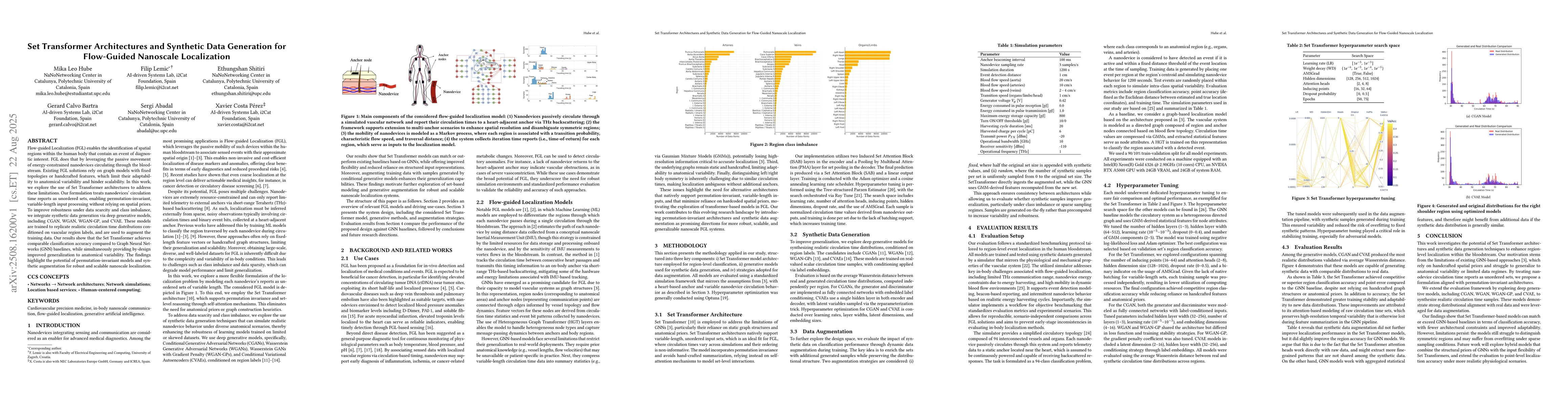 Flow-guided Localization (FGL) enables the identification of spatial regions within the human body that contain an event of diagnostic interest. FGL does that by leveraging the passive movement of energy-constrained nanodevices circulating through the bloodstream. Existing FGL solutions rely on graph models with fixed topologies or handcrafted features, which limit their adaptability to anatomical variability and hinder scalability. In this work, we explore the use of Set Transformer architectures to address these limitations. Our formulation treats nanodevices' circulation time reports as unordered sets, enabling permutation-invariant, variable-length input processing without relying on spatial priors. To improve robustness under data scarcity and class imbalance, we integrate synthetic data generation via deep generative models, including CGAN, WGAN, WGAN-GP, and CVAE. These models are trained to replicate realistic circulation time distributions conditioned on vascular region labels, and are used to augment the training data. Our results show that the Set Transformer achieves comparable classification accuracy compared to Graph Neural Networks (GNN) baselines, while simultaneously providing by-design improved generalization to anatomical variability. The findings highlight the potential of permutation-invariant models and synthetic augmentation for robust and scalable nanoscale localization.
