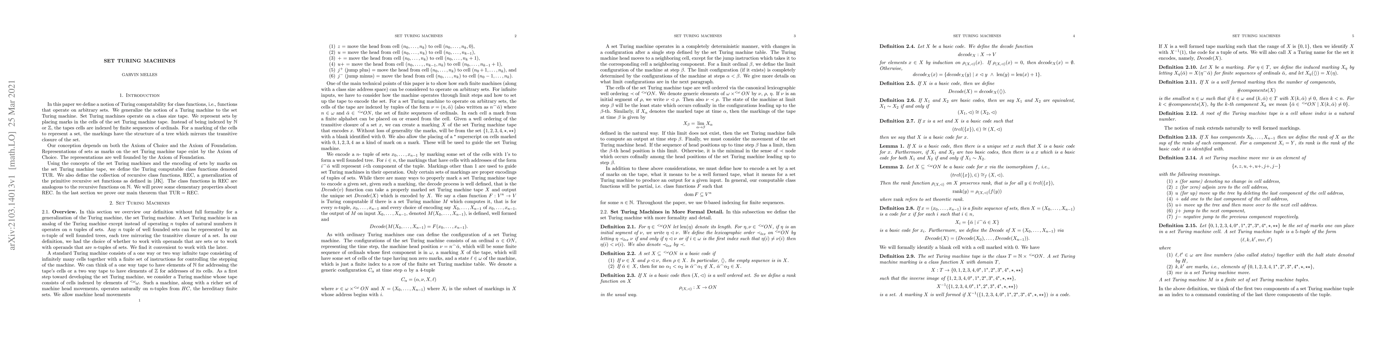 Summary: This paper introduces a generalized Turing machine that operates on general sets, proving that its computable functions are equivalent to Set Recursive functions. The key result establishes a fundamental equivalence between these two computational models.