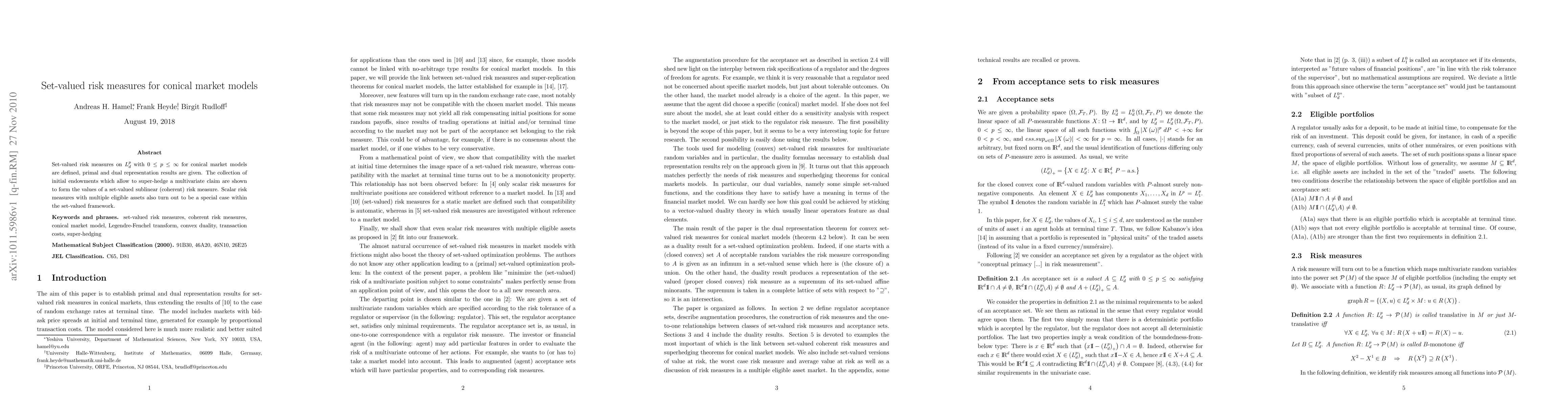 This paper defines set-valued risk measures for conical market models, providing both primal and dual representation results. It demonstrates that the set of initial endowments needed to super-hedge a multivariate claim corresponds to the values of a set-valued sublinear (coherent) risk measure, with scalar risk measures being a special case within this framework.