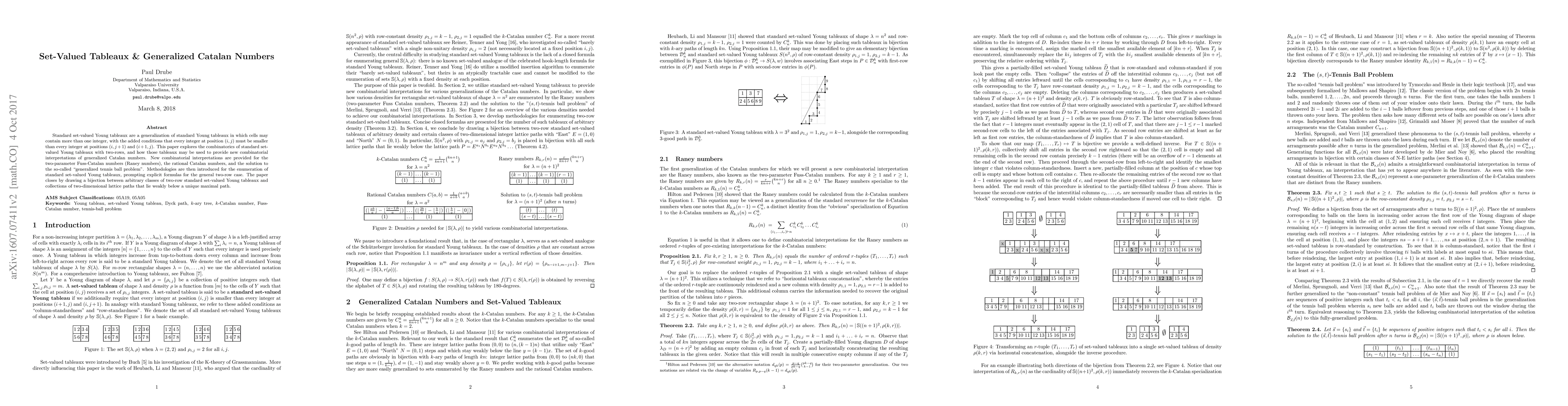 This paper explores the combinatorics of two-row standard set-valued Young tableaux, providing new interpretations for generalized Catalan numbers, including Fuss-Catalan numbers and rational Catalan numbers. It also introduces methodologies for enumerating these tableaux and establishes a bijection with lattice paths.