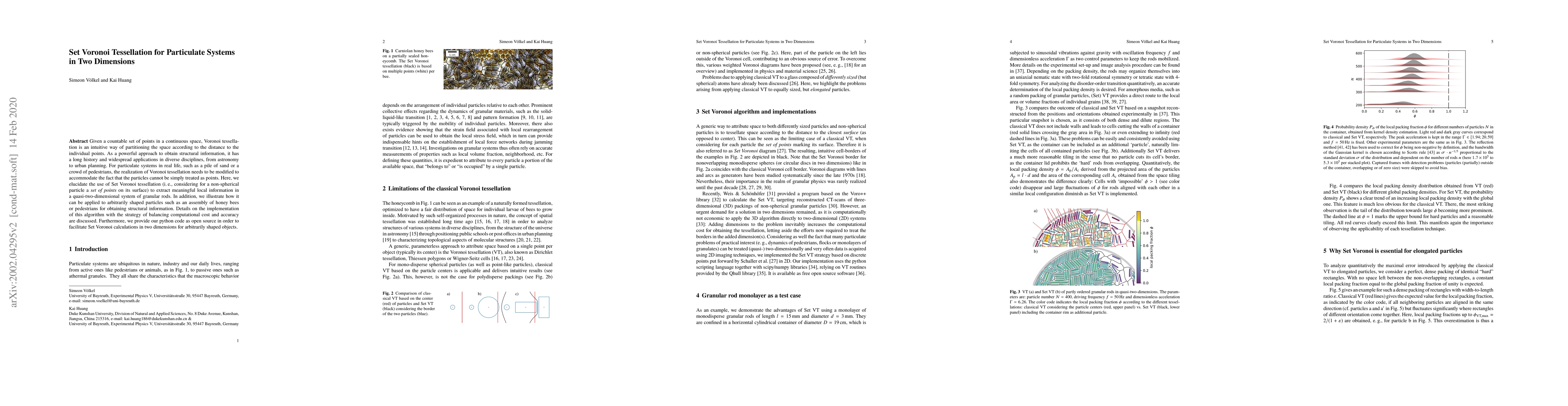 This paper proposes Set Voronoi tessellation for analyzing particulate systems in two dimensions, considering particles as sets of surface points rather than simple points. The method is demonstrated for granular rods and arbitrarily shaped particles, with an emphasis on balancing computational cost and accuracy, and open-source Python code is provided for implementation.