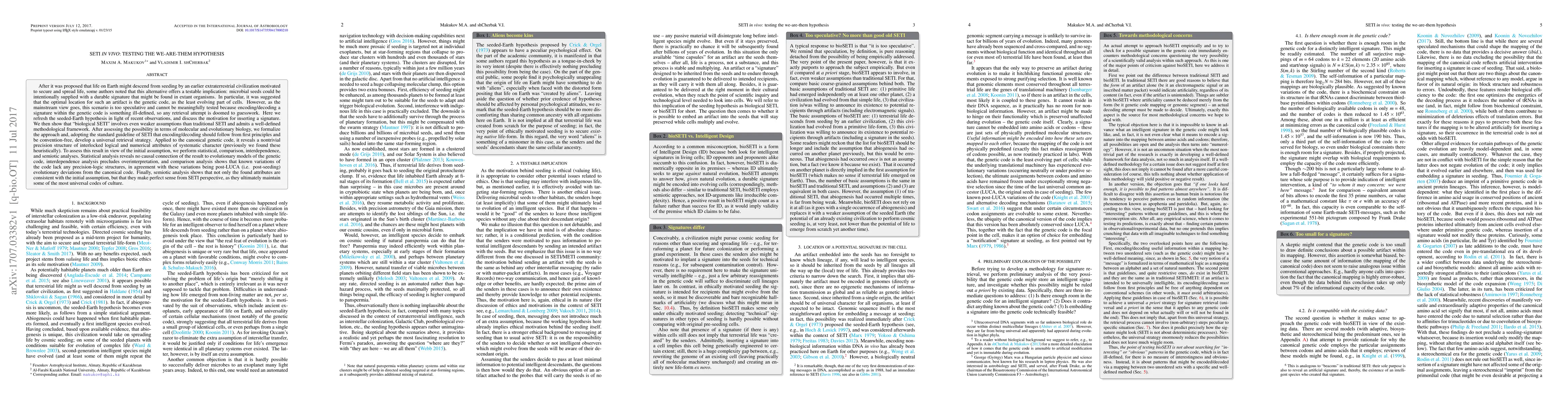 After it was proposed that life on Earth might descend from seeding by an earlier civilization, some authors noted that this alternative offers a testable aspect: the seeds could be supplied with a signature that might be found in extant organisms. In particular, it was suggested that the optimal location for such an artifact is the genetic code, as the least evolving part of cells. However, as the mainstream view goes, this scenario is too speculative and cannot be meaningfully tested because encoding/decoding a signature within the genetic code is ill-defined, so any retrieval attempt is doomed to guesswork. Here we refresh the seeded-Earth hypothesis and discuss the motivation for inserting a signature. We then show that "biological SETI" involves even weaker assumptions than traditional SETI and admits a well-defined methodological framework. After assessing the possibility in terms of molecular and evolutionary biology, we formalize the approach and, adopting the guideline of SETI that encoding/decoding should follow from first principles and be convention-free, develop a retrieval strategy. Applied to the canonical code, it reveals a nontrivial precision structure of interlocked systematic attributes. To assess this result in view of the initial assumption, we perform statistical, comparison, interdependence, and semiotic analyses. Statistical analysis reveals no causal connection to evolutionary models of the code, interdependence analysis precludes overinterpretation, and comparison analysis shows that known code variations lack any precision-logic structures, in agreement with these variations being post-seeding deviations from the canonical code. Finally, semiotic analysis shows that not only the found attributes are consistent with the initial assumption, but that they make perfect sense from SETI perspective, as they maintain some of the most universal codes of culture.