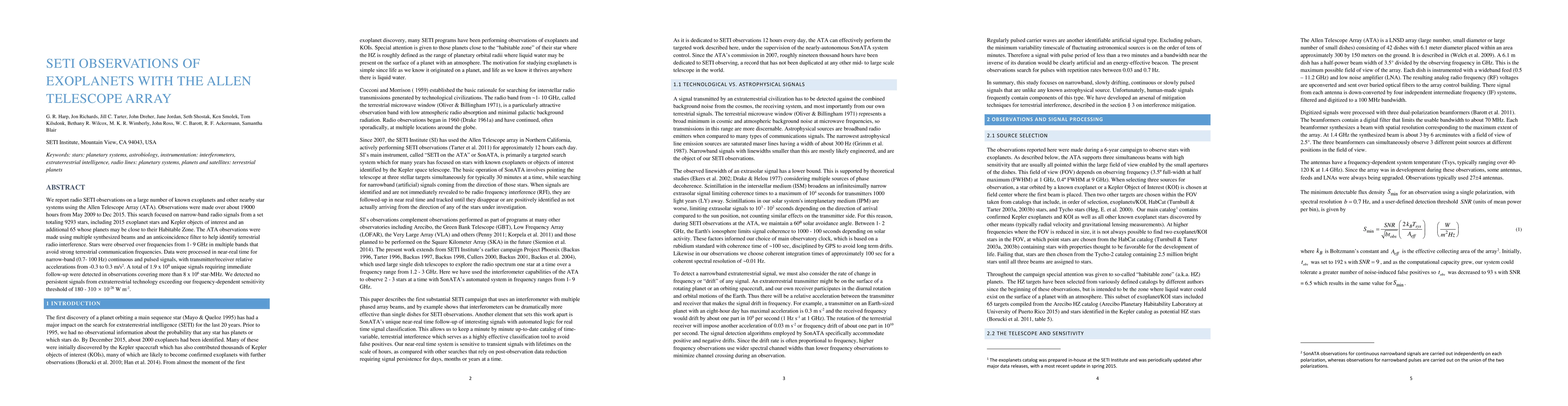This paper details a comprehensive SETI radio search using the Allen Telescope Array over 19,000 hours from 2009 to 2015, targeting 9,293 stars including exoplanets. Despite detecting 1.9 x 10^8 signals, no persistent extraterrestrial signals were found above the sensitivity threshold.