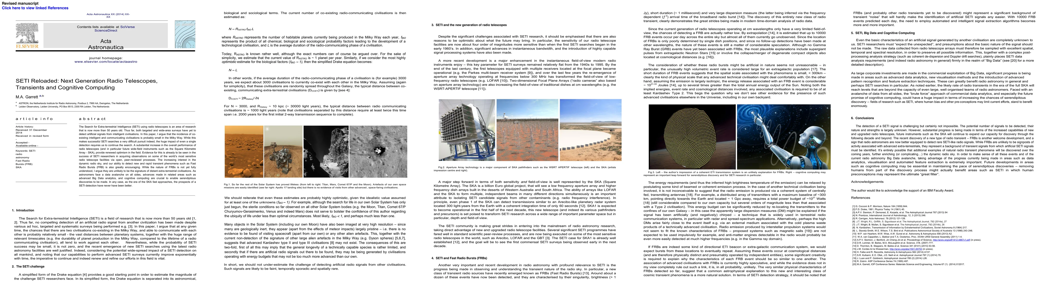 This paper discusses the ongoing Search for Extra-terrestrial Intelligence (SETI) and posits that the likelihood of finding intelligent civilizations in the Milky Way is low. However, advancements in radio telescope technology, particularly the upcoming Square Kilometre Array (SKA), and the detection of transient phenomena like Fast Radio Bursts (FRB), offer renewed hope for SETI discoveries, alongside the importance of cognitive computing and Big Data analytics to manage the vast amounts of data.