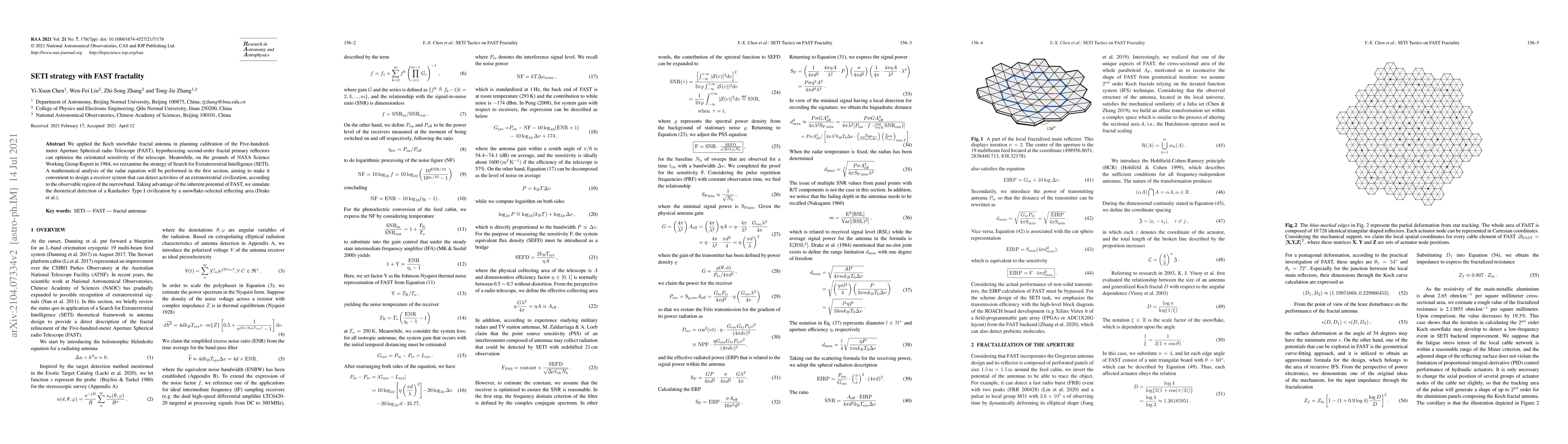 This paper explores the application of Koch snowflake fractal antennas in optimizing the sensitivity of the FAST telescope, proposing that second-order fractal reflectors can enhance its oriented sensitivity. It also revisits the SETI strategy, aiming to design a receiver system that can detect extraterrestrial civilizations based on mathematical analysis of the radar equation.