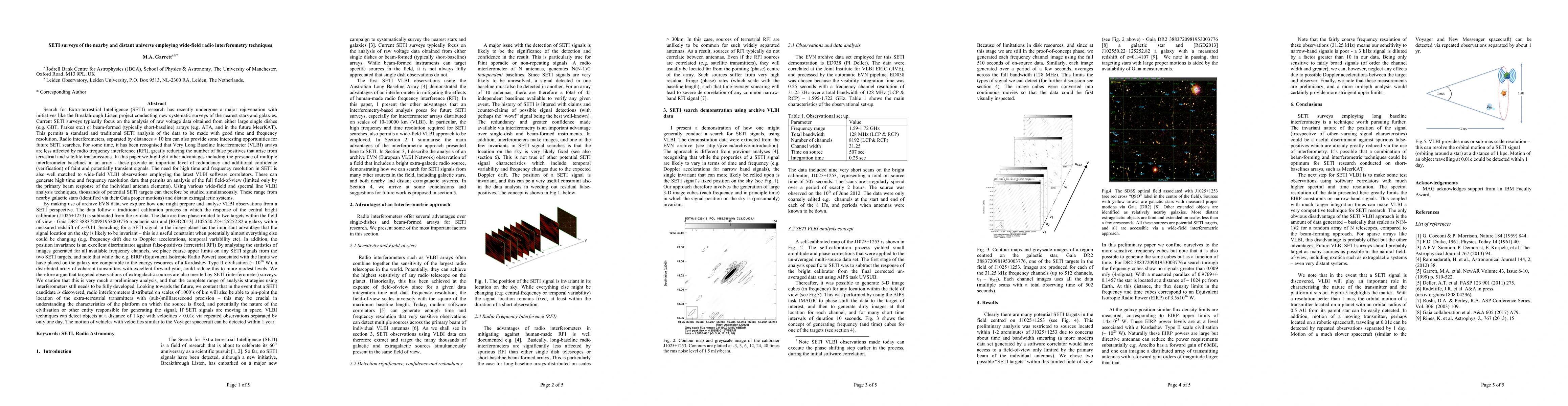 This paper explores the advantages of using long baseline radio interferometers for SETI searches, highlighting the reduction in false positives and the ability to verify faint signals through array redundancy. It demonstrates the potential of VLBI techniques to analyze thousands of targets simultaneously and discusses the benefits of using archive data for SETI searches, placing upper limits on signals from a galactic star and a nearby galaxy.